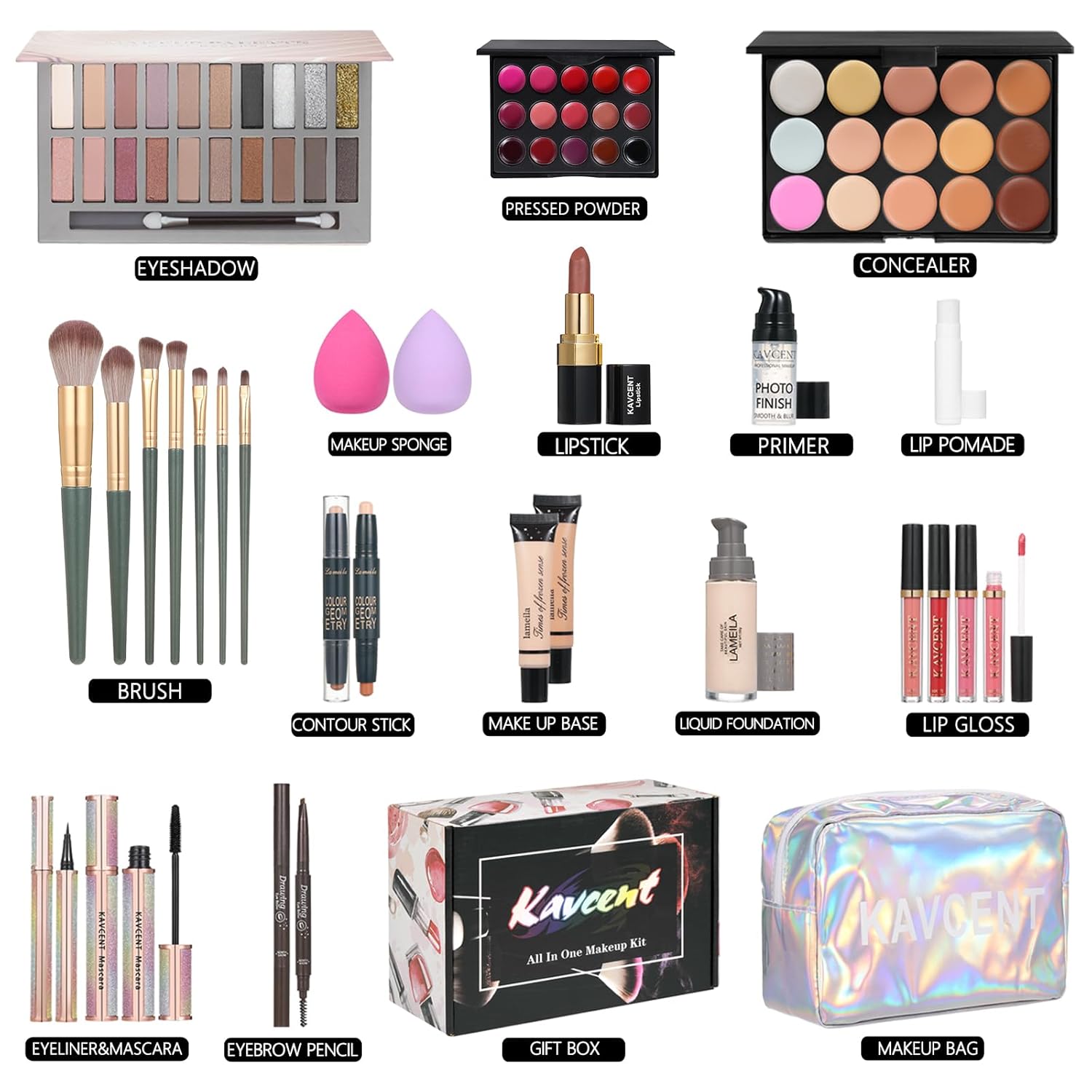 - ăAll In One Makeup KitsăA perfect makeup sets that includes Foundation,Face Primer,20 Color eyeshadow palette, lipstick palette, lipgloss, lipstick ,concealer cream, makeup brush, concealer palette, Contour Stick,eyeliner, lip balm, mascara,powder puff, Cosmetic bag
