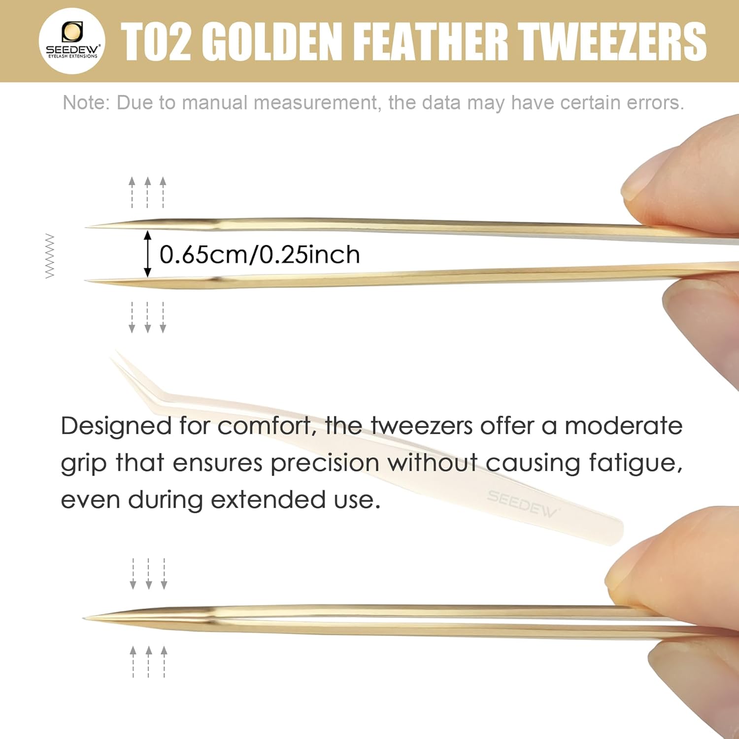 - đšăT02 Golden Feather TweezersăThe 45 degree Golden Feather Tweezers are the most popular style of tweezers that lots of eyelash artists like to use. They are mainly used for eyelashes blooming, or for picking up eyelashes for grafting.