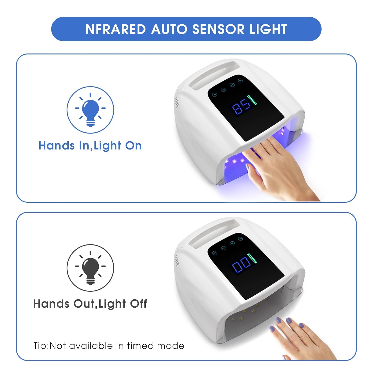- 【Painless Curing Mode & Infrared Senor】 Our rechargeable UV LED nail lamp provides smart over-temperature protection for your hands and eyes,protects your tender skin from getting dark or burned.In 90s mode,it can relieve burning sensation and bring you a comfortable salon-like manicure experience