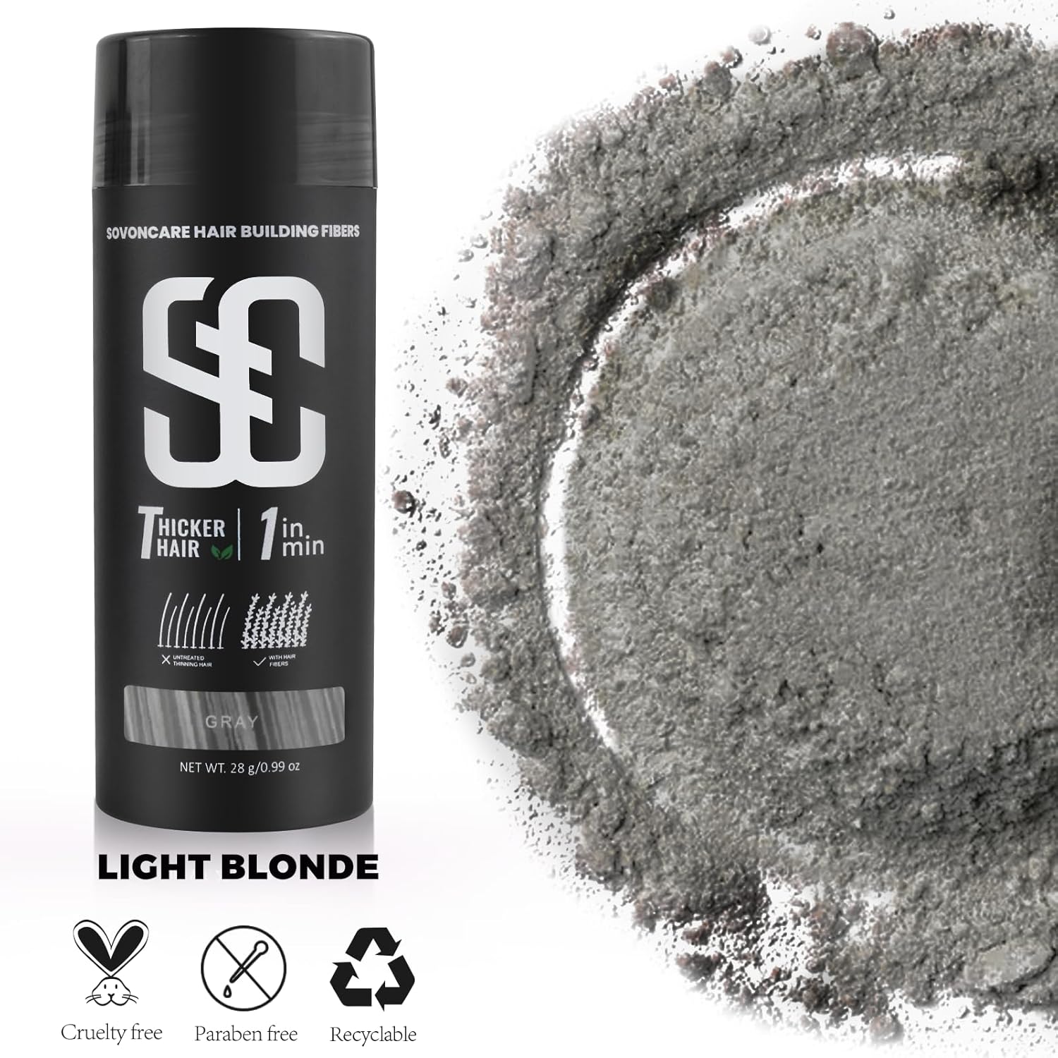 SOVONCARE Hair Fibers for Thinning Hair Gray, Hair Building Fibers for Bald Spots Undetectable & Natural, Conceals Hair Loss Fill In Fine, Hair Powder Hair Thicker Instantly for Women & Men 28g