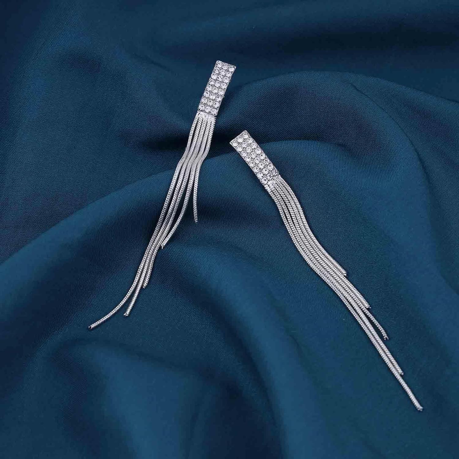 - Long tassel drop earrings.Item Details:Handmade Item.Size:As Shown.Color:Silver.Materials:Quality Alloy/Crystal.Location:Ear.Style:Boho/Vintage.