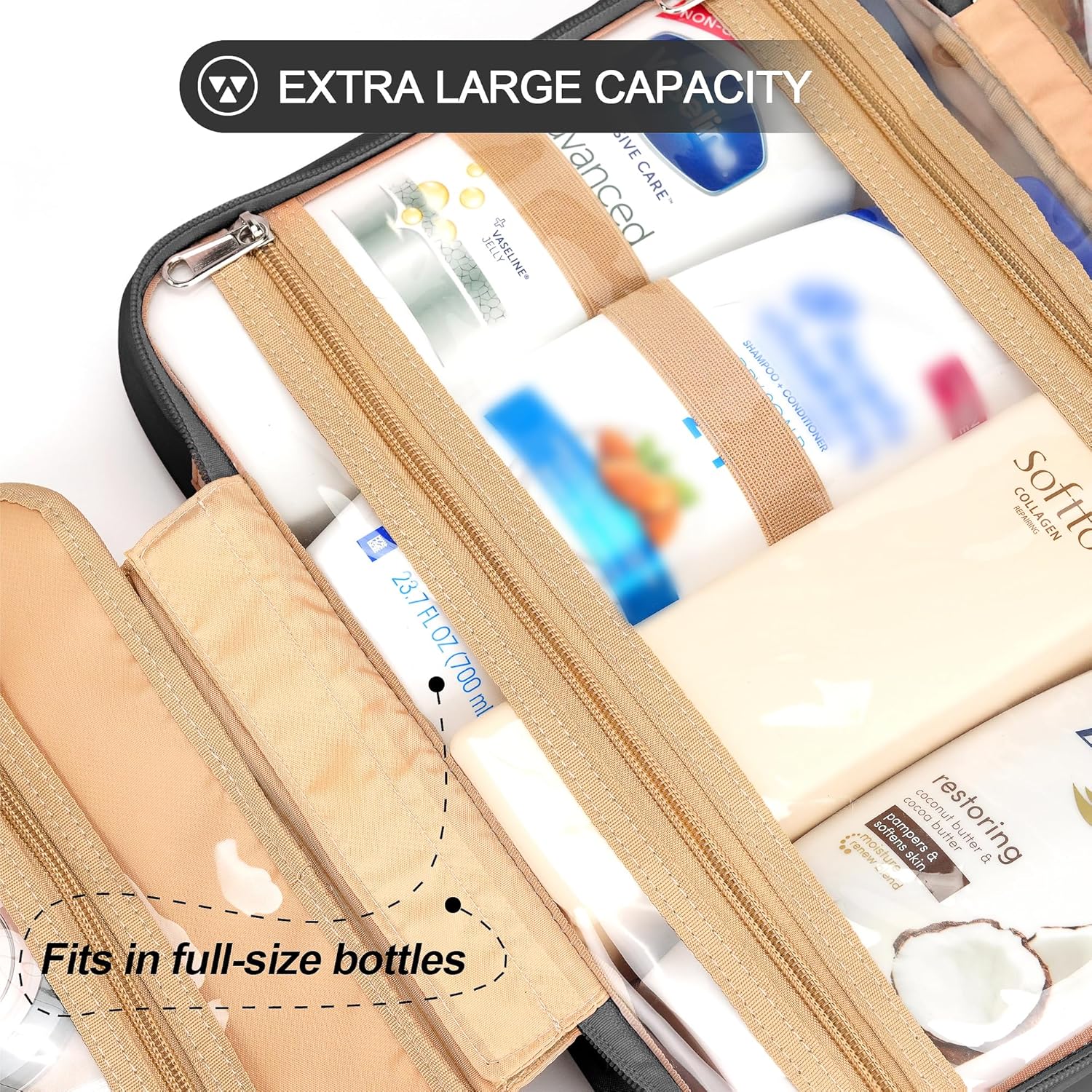 - CONSIDERABLE DESIGN - The elastic bands inside the two main compartments can keep the different height bottles fixed and upright. Your comb, toothbrush, razor, and leak-prone makeup can all go in there, even a hair dryer. 360ยฐ metal hook gives you a variety of hanging options.
