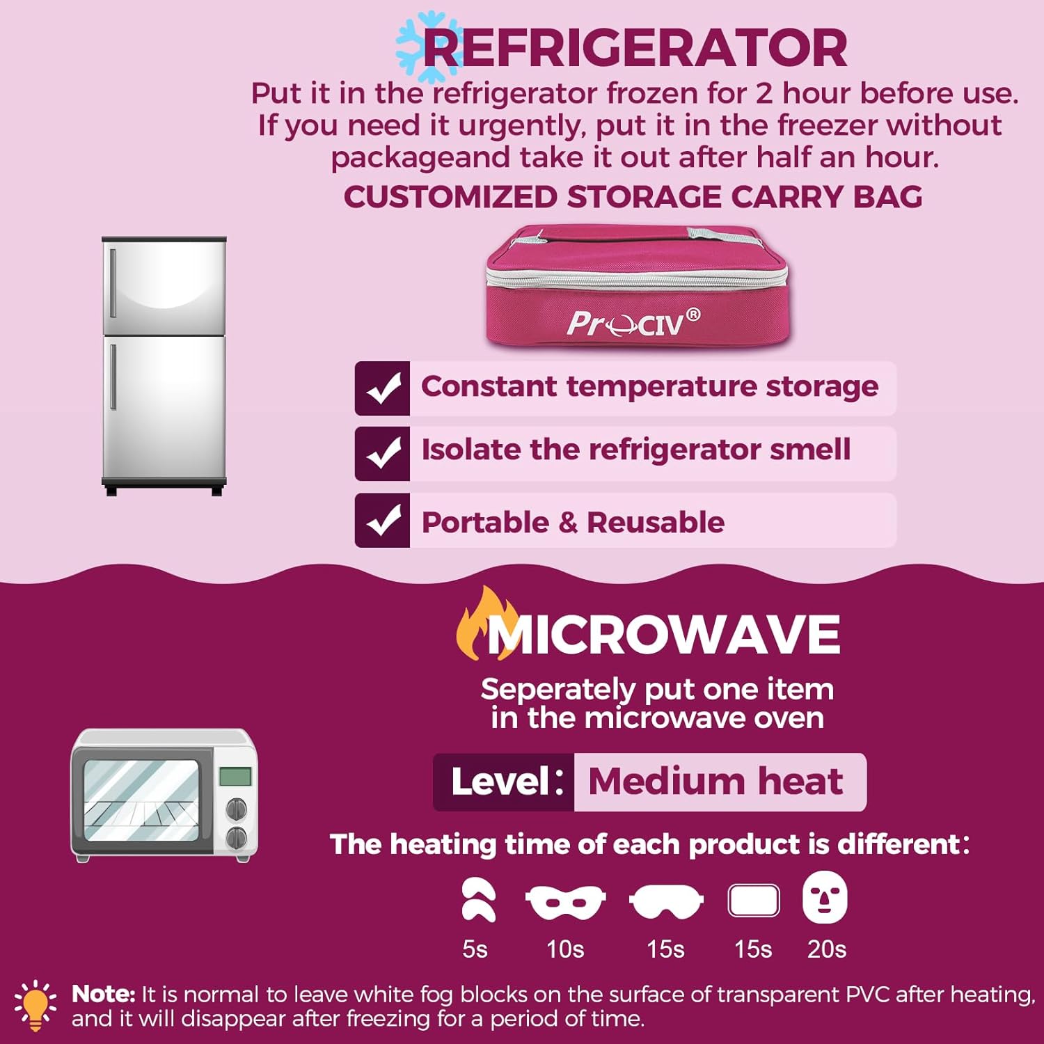 - โ๐ฅโใHot and Cold CompressใProCIV gel eye mask set can be chilled in the refrigerator for use as an ice pack, or heated in the microwave as a heated eye mask. Has good temperature storage effect, ๐๐๐๐ฉ ๐๐๐/๐๐๐ซ๐ฆ for up to ๐๐-๐๐ ๐๐ข๐ง๐ฌ. Effectively amazing for tired eyes relief, fatigue, dark circles, puffiness and the wrinkles. Note: Put it in the ๐ ๐ซ๐๐๐ณ๐๐ซ frozen for ๐๐จ ๐๐จ๐ซ๐ ๐๐ก๐๐ง ๐๐๐ฅ๐ ๐๐ง ๐๐จ๐ฎ๐ซ. If the time is too long, it will become frozen and hardened.