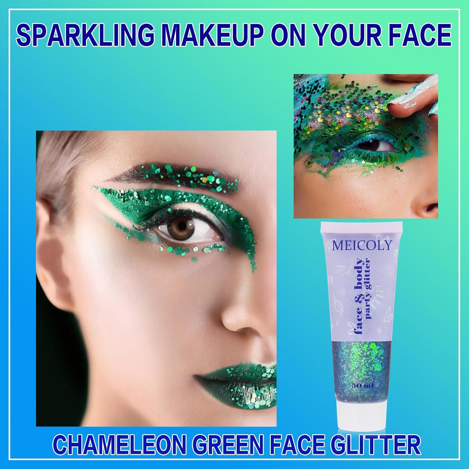 - Easy to Apply and Long Lasting:MEICOLY chameleon green face glitter gel sticks to the skin very easily,it goes on smooth and dries quickly without becoming flakey,stays on well and hold up all day with bright and shiny effect,perfect st. patrick's day face glitter for adults and kids