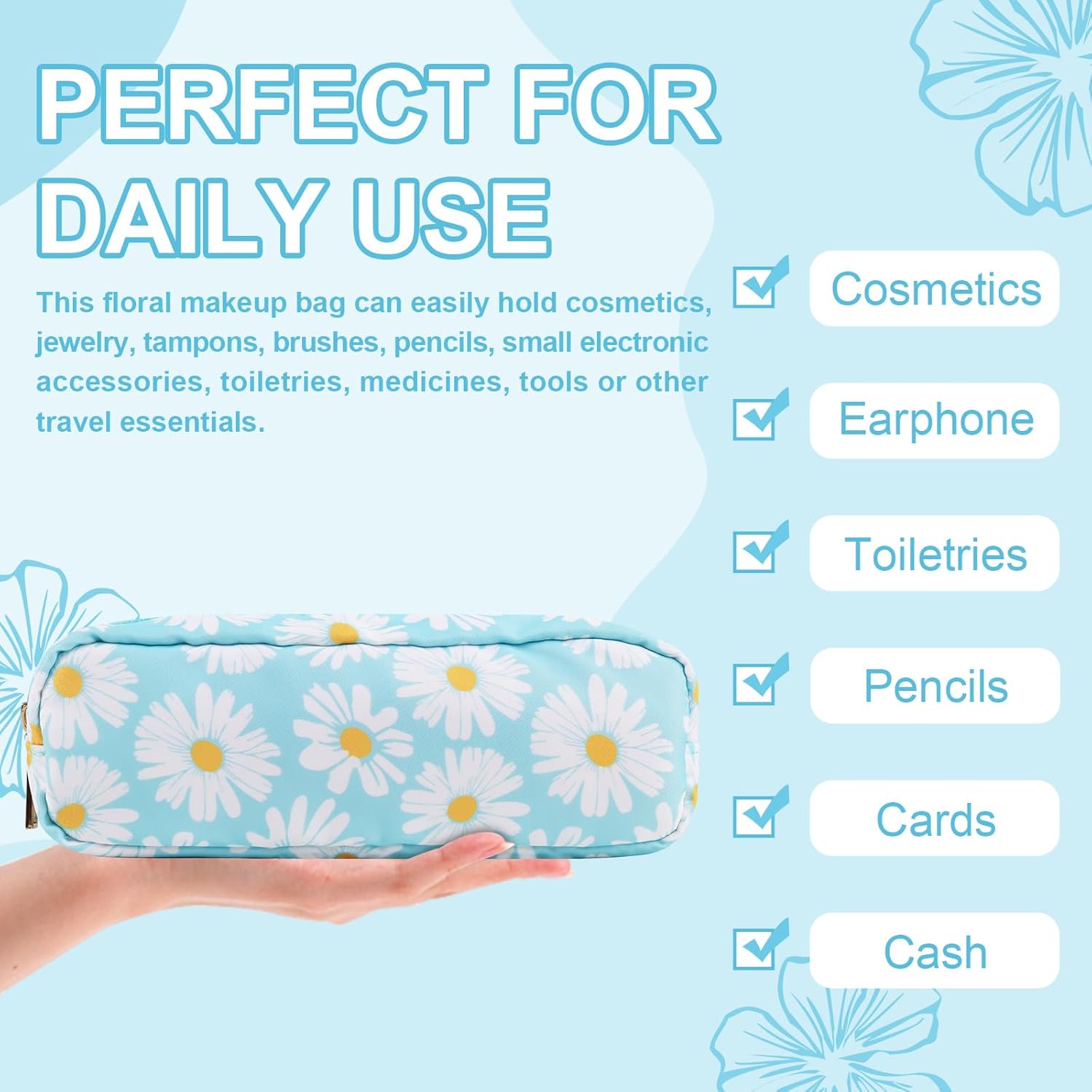 Waterproof Small Floral Pencil Case Makeup Bag for Purse,Cute Flower Pencil Pouch Preppy Nylon Makeup Brush Holder with Zipper,Girls Portable Storage Case Small Pen Bag for Work(Slim Blue-Daisy)