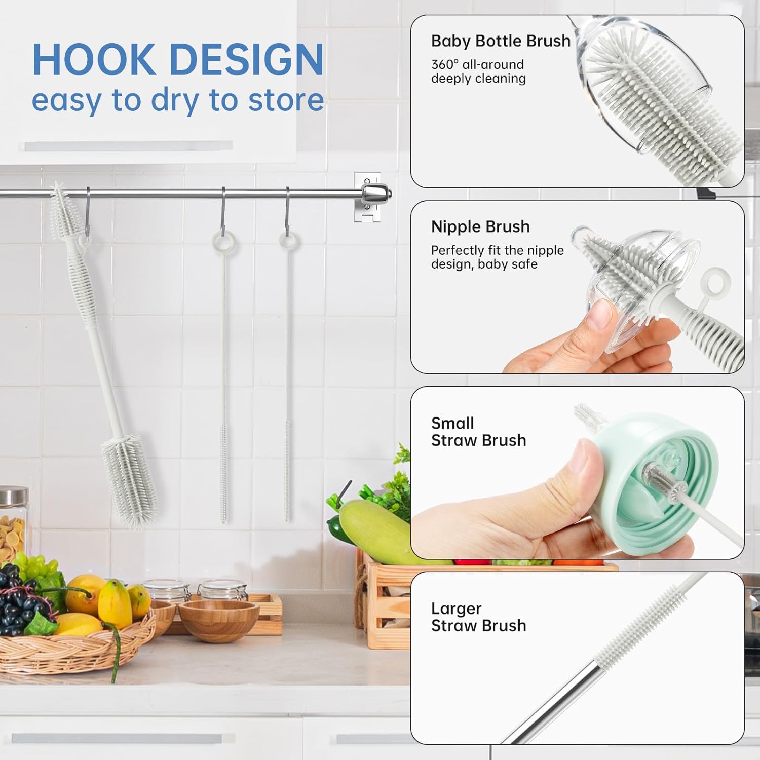 - Complete Baby Bottle Brush and Straw Cleaner Brush Set: In addition to the bottle brush, this set also includes two silicone straw cleaner brushes for complete cleaning coverage. This sturdy and flexible set reaches deep inside containers and straws for total cleanliness