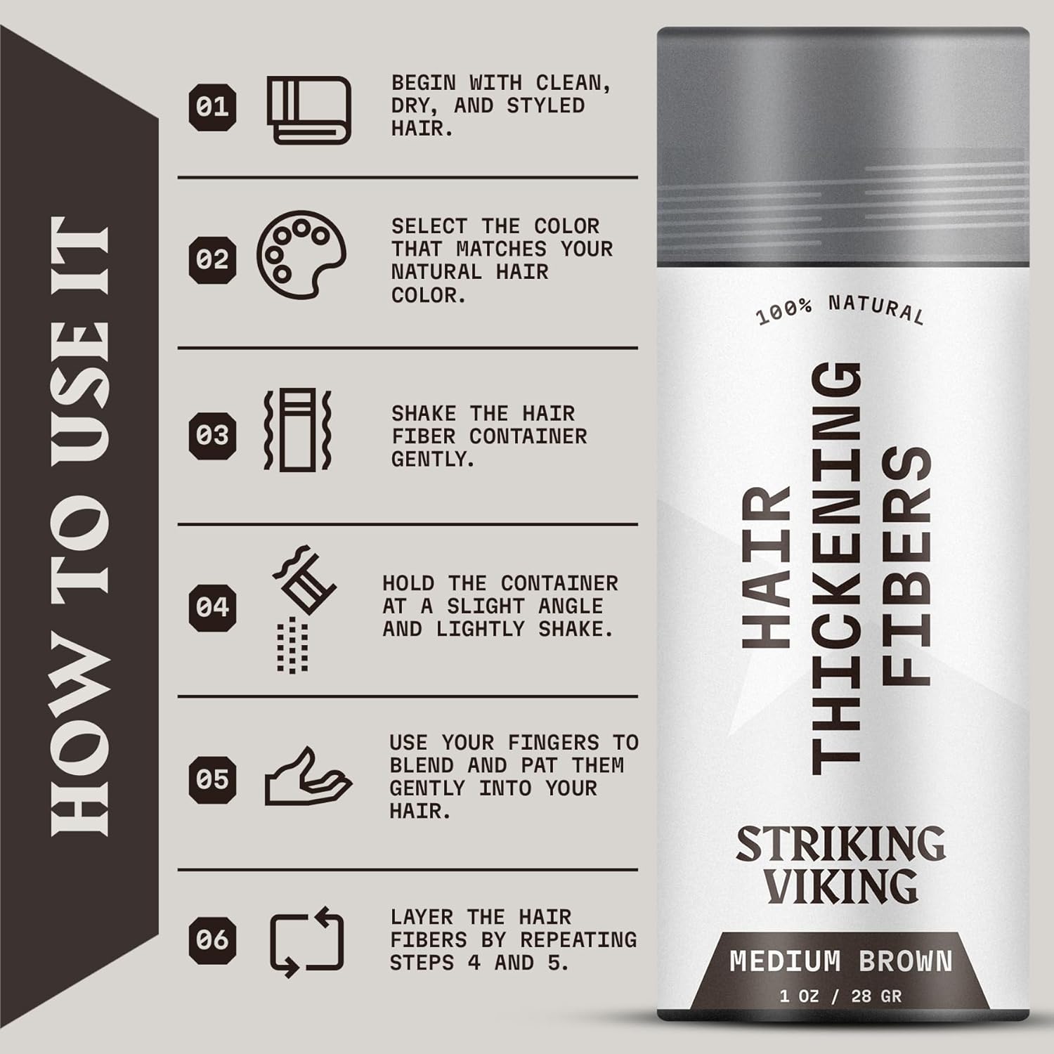 - Striking Viking Power: Striking Viking Hair Fibers amp up your style with a bold, fuller look. This hair thickening powder is your go-to for tackling thinning hair and bald spots with Viking strength