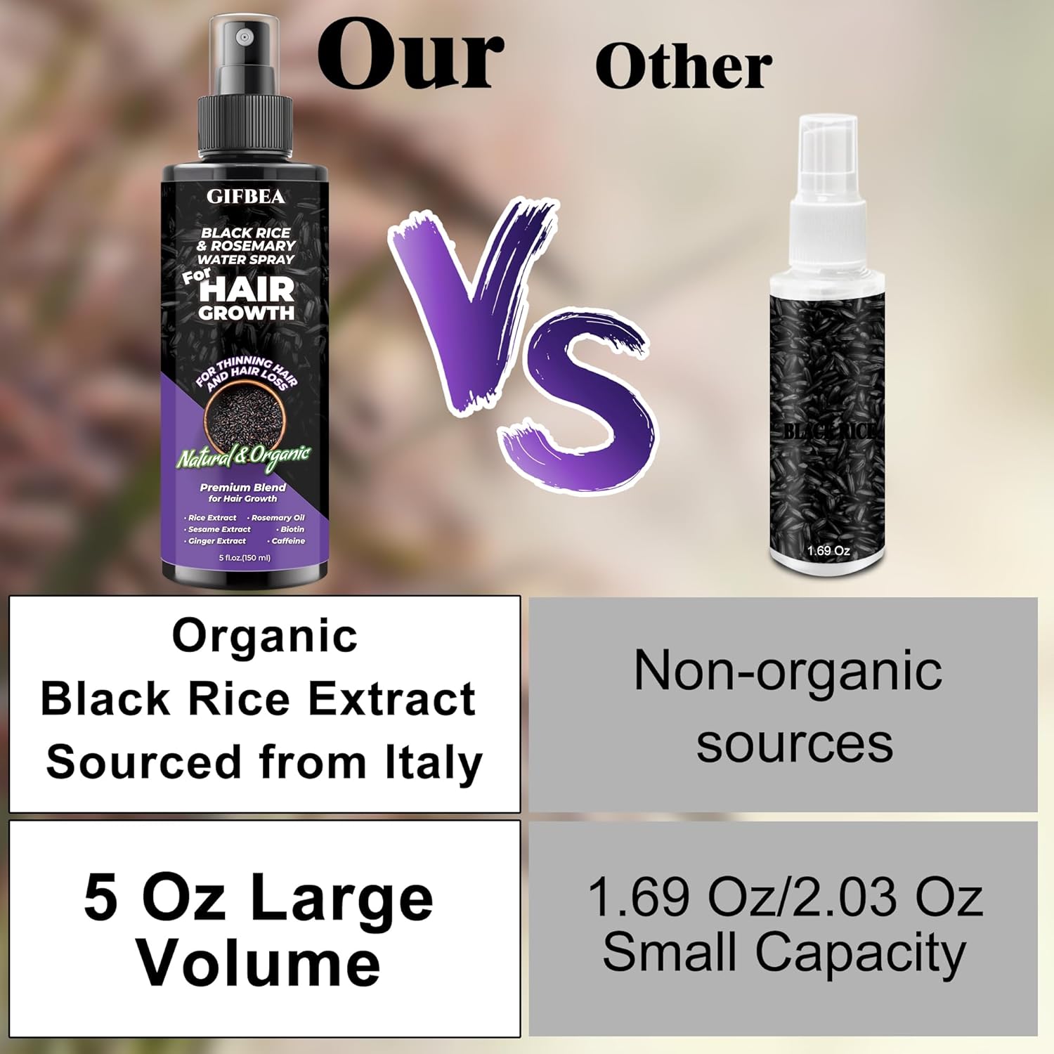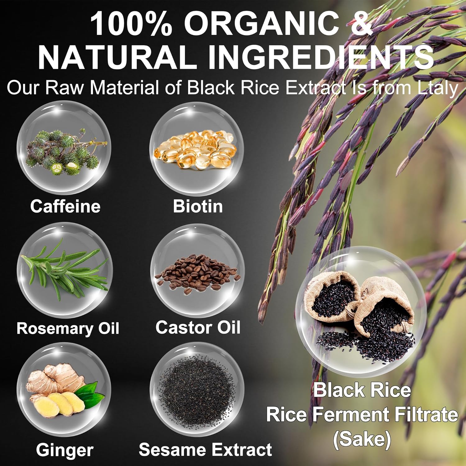 - 【100% Organic & Natural Ingredients】Our raw material of black rice extract is from italy,100% organic & natural,infused with rosemary oil,biotin,castor oil,sesame extract,ginger,and caffeine,playing a crucial role in hair growth.Formulated with these premium ingredients,our organic hair growth spray offers the best care for your hair.Applying this rice water hair growth spray to the scalp,hairlines,and ends nourishes the scalp and strengthens the hair shaft,boosting overall hair growth.
