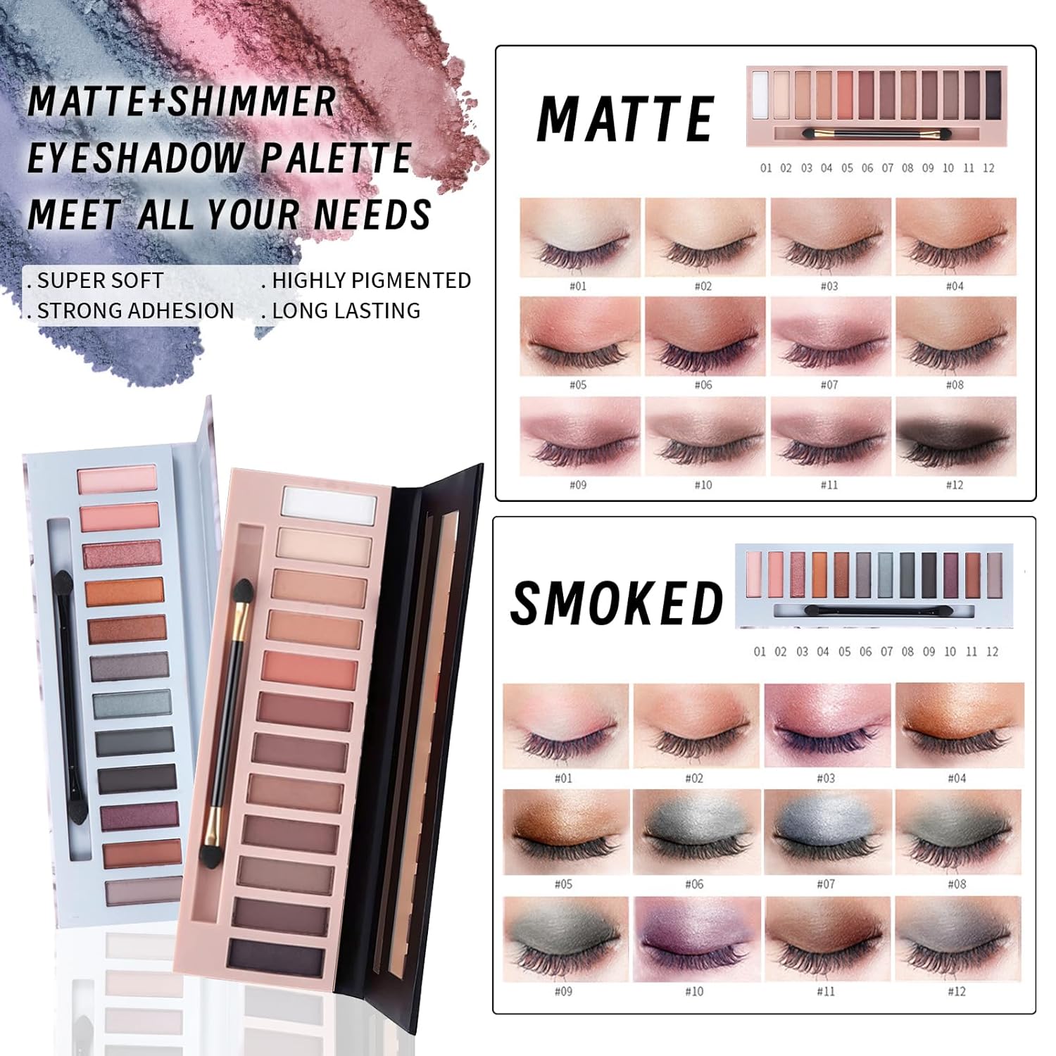 - [Full Face Makeup Set] The multipurpose makeup present set for women includes Full Coverage Nude & Buff Beige Foundation, Matte & Shimmer 12 Colors Eyeshadow Palette, 3pcs Liquid Lipsticks, Face Primer, Dual-Ended Counter Stick, Waterproof Cosmetic Bag, Eyebrow Soap set, Dual-ended Eyebrow Pencil, Winged Eyeliner Stamp, Waterproof Mascara, Makeup Brush & 2PCs Makeup Sponges. It can meet all the beginners’ or professional makeup artists’ needs for daily makeup.