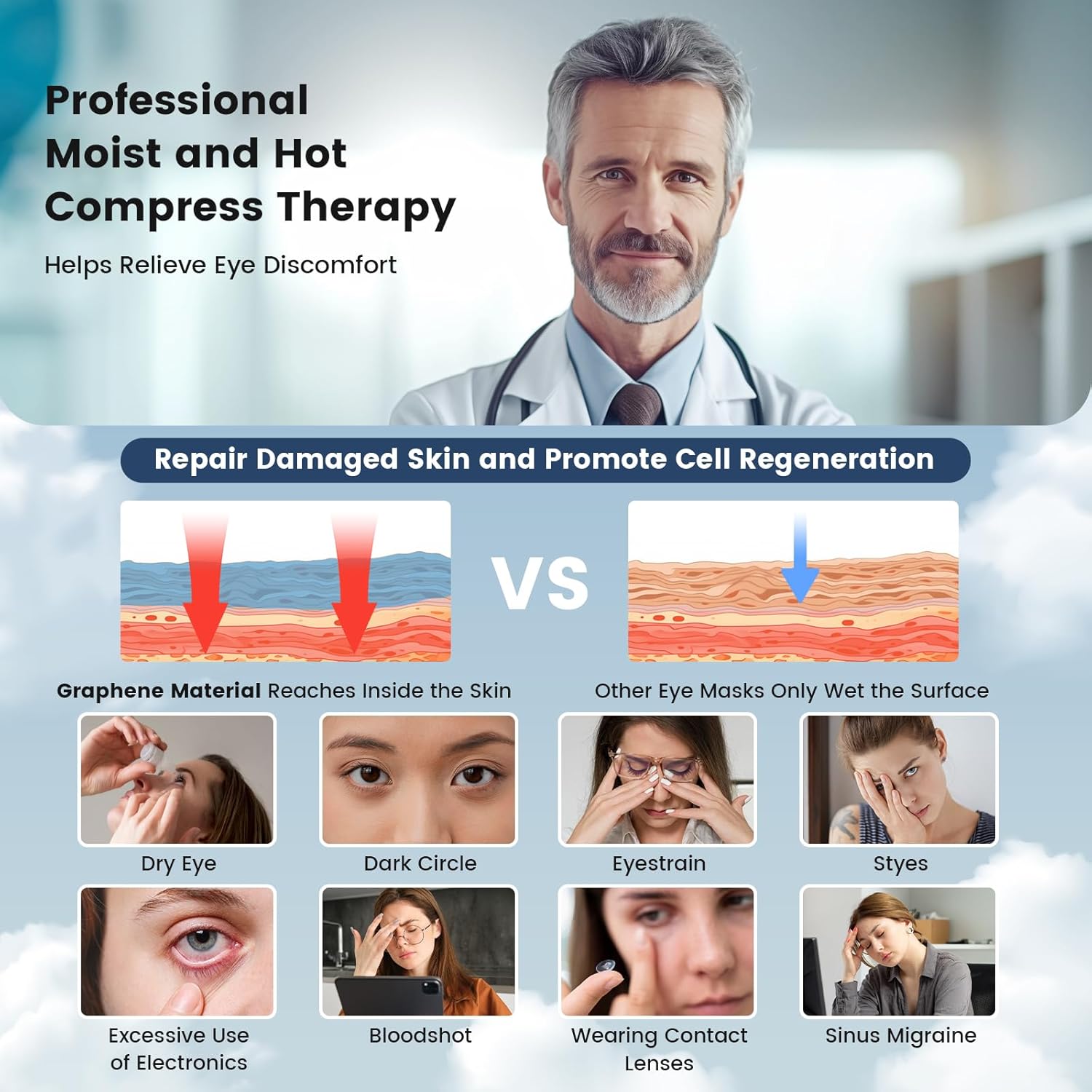 - Long-lasting Warmth for 40-60 Mins: Our dry eye mask utilizes advanced graphene material, ensuring consistent heating for 40-60 minutes. Compared to other steam eye masks, heated eye mask maintains a more durable and constant temperature. Graphene's unique high-temperature control evenly heats, preventing any risk of burning your eyes.