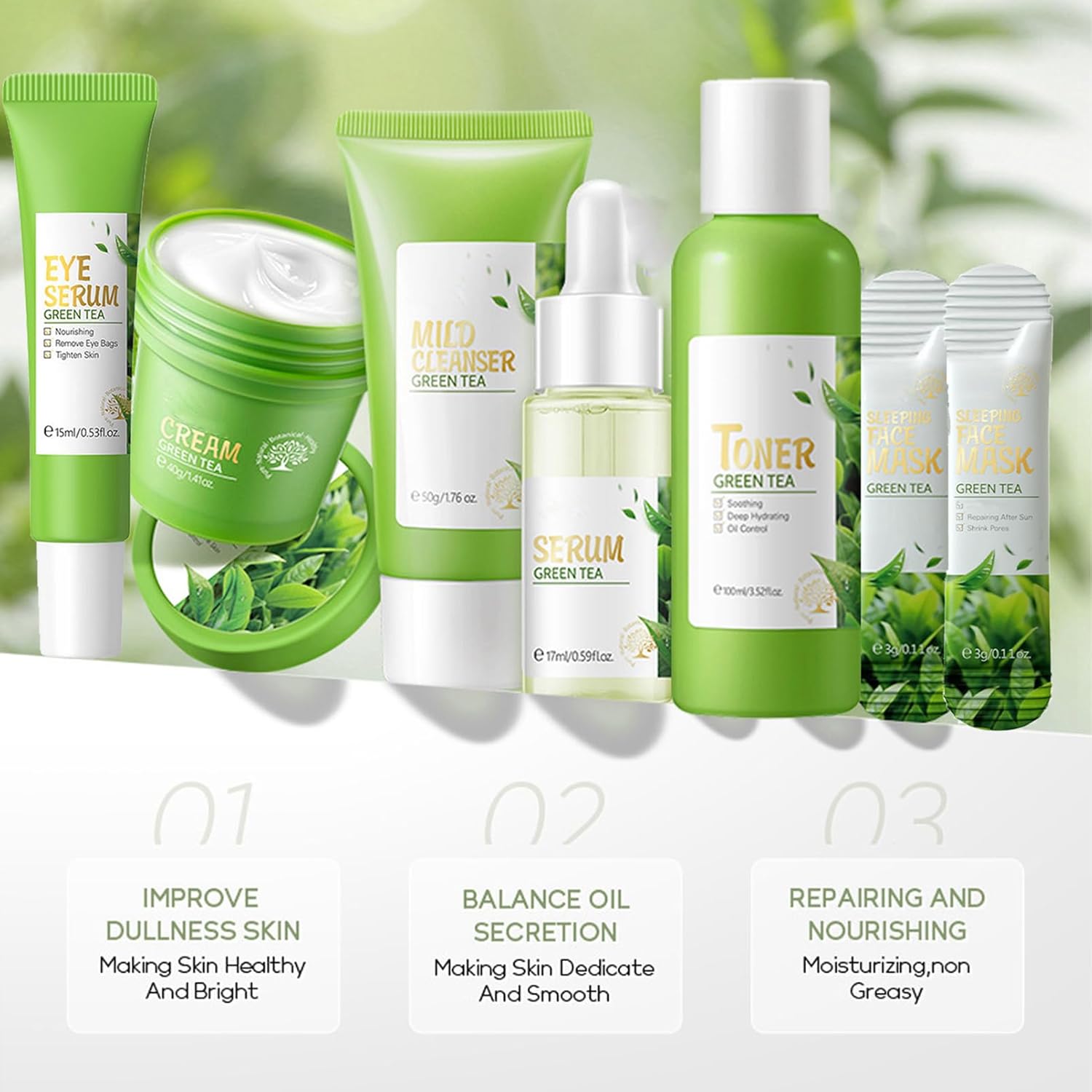 - 【Green Tea Serum Skincare Set】Our skincare kit includes Toner, Serum, Face Cream, Eye Cream Cleanser, 2pcs Sleep Mask.the skin care routine kit for women contains natural green tea extract, can effectively hydrate your face,clean skin pores, deep clean skin dirt, adjust skin water and oil balance, replenish skin moisture, nourish skin