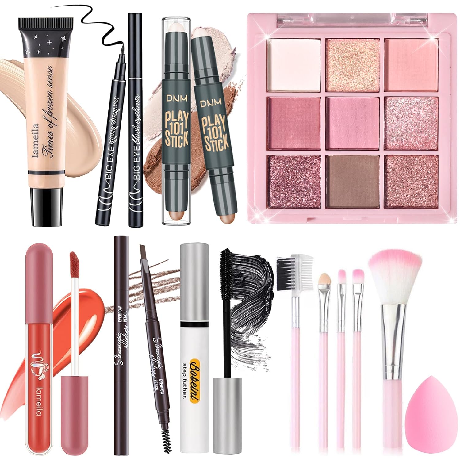 - [ Makeup Set] The ideal starter makeup kit includes 9 colors eyeshadow palette, dual-ended counter and highlighter stick, full coverage liquid foundation, dual-ended eyebrow pencil, eyeliner, waterproof mascara, lip gloss, 5 PCs makeup brushes set, makeup sponge. All women’s makeup essentials are included.