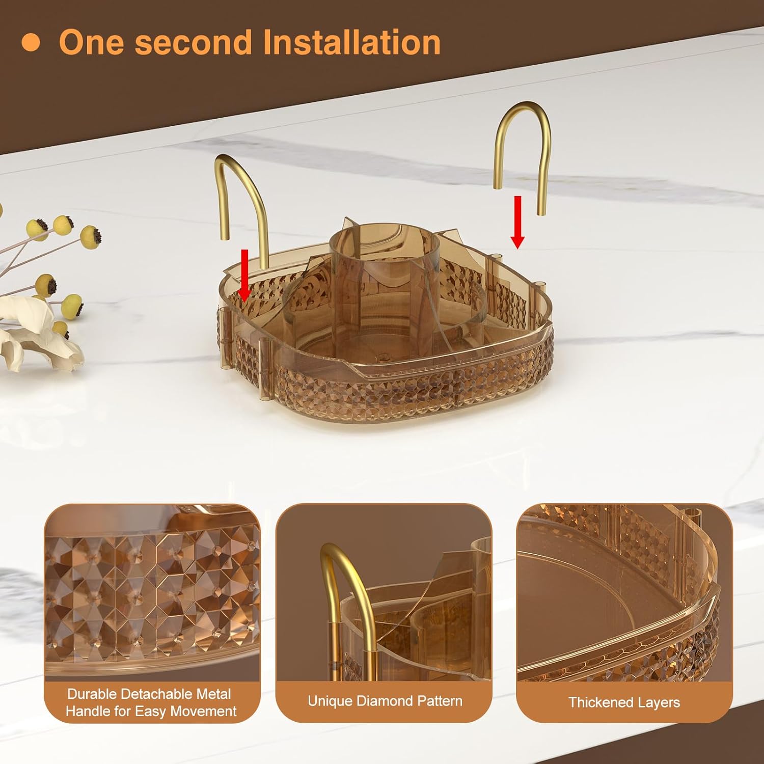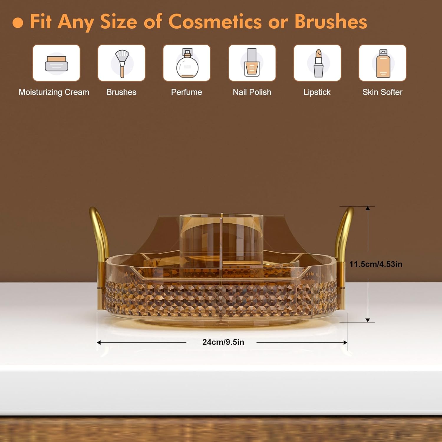 • Washable and Metal Stand:➤Awenia cosmetic organizer with clear acrylic material can be washed or wiped with a damp cloth,cleaned as good as new.Gold stainless steel stand and unique diamond pattern make the perfume organizer more strong,firm beautiful and easy to move. The 360 makeup organizer can be place in Dresser,Bathroom and Kitchen.