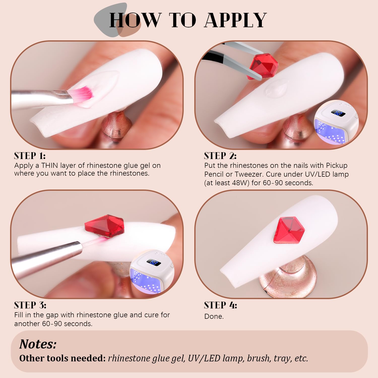 • 💎EASY TO USE -- Easy to apply on artificial nails. After applying nail polish and applying enough gel on the nails, simply use the equipped tools (pickup pen + tweezers) to pick up the crystals onto your nails to create your fabulous DIY designs! These crystals gemstones are different from those hotfix stones, they are not self-adhesive, you have to apply glue to stick them (glue is not included.)