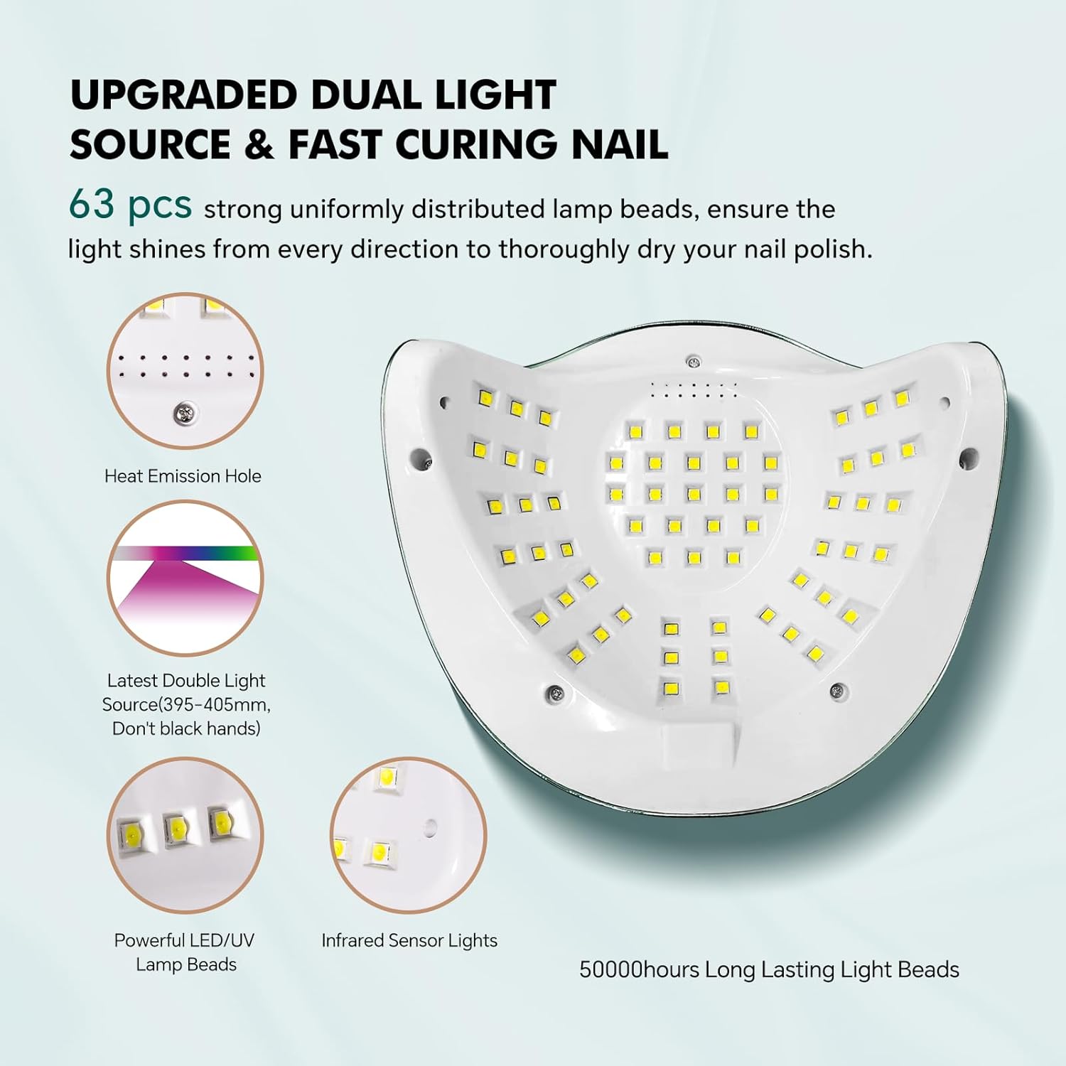- 🎁【63pcs Lamp Beads 10s Fast Drying】 MIRAGE LAYON LED nail lamp is professional designed with 63pcs lamp beads, can provide 288w maximum power--over 200% energy than other normal UV nail lamps. 63pcs long-lasting 5000 hours life time lamp beads are evenly distributed, can achieve 10 seconds quick drying without any blind area. It can work with all kinds of gels.