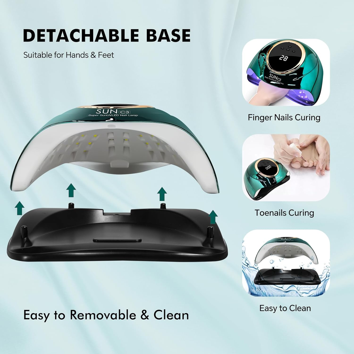 - 🎁【Coloured Glaze Green Paint& ABS Material】ABS Material, make this gel lamp have long service lifetime. If the surface is accidentally stained with nail polish, just wipe it gently with a cotton cloth. Detachable base design is more convenient for toenail gel drying. Hands and feet Mode can switch at will.