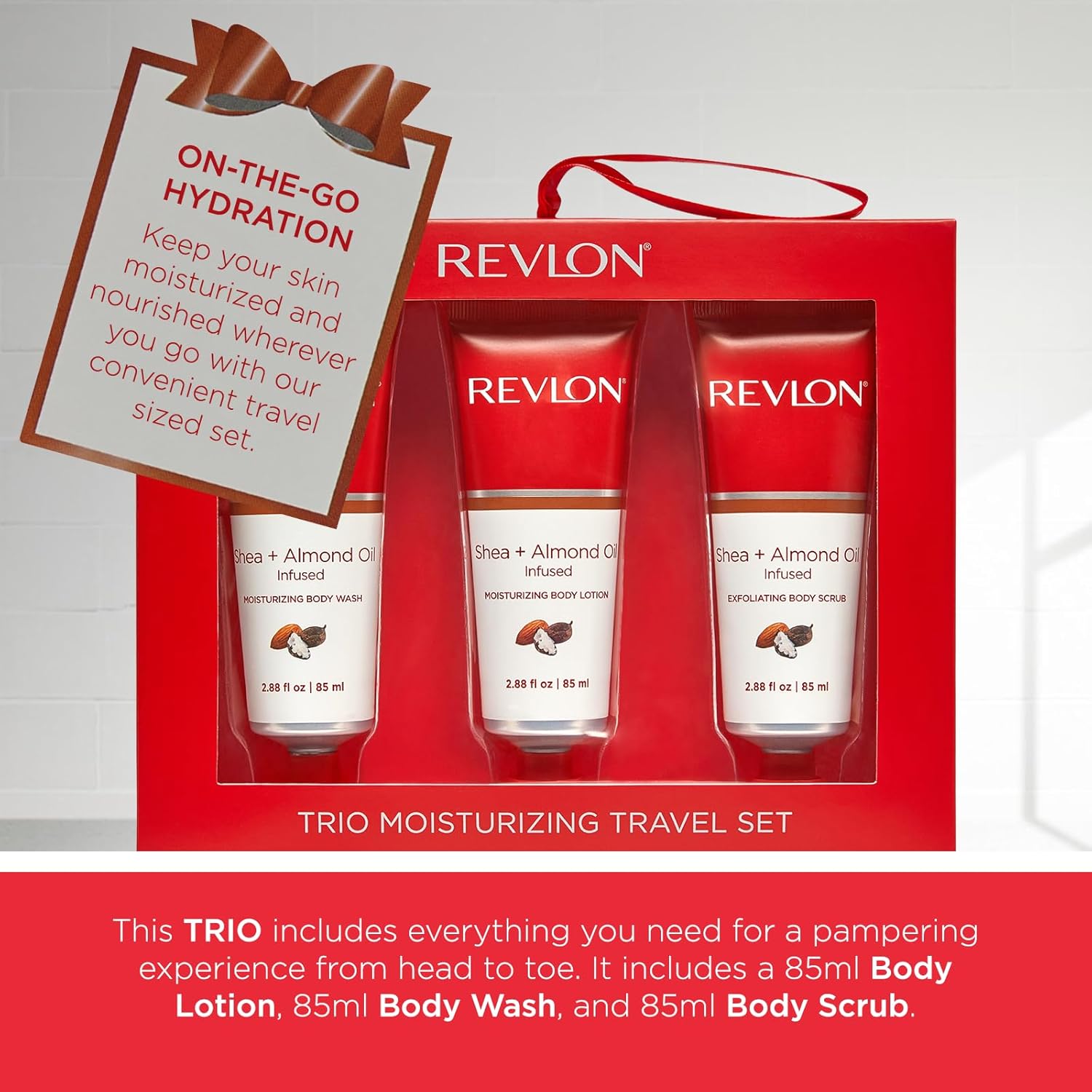 REVLON Get Carried Away Trio Moisturizing Travel Set, Shea Butter and Almond Oil Infused, Moisturizing Body Wash, Body Lotion, Exfoliating Body Scrub, 3 Count (2.88 fl oz)