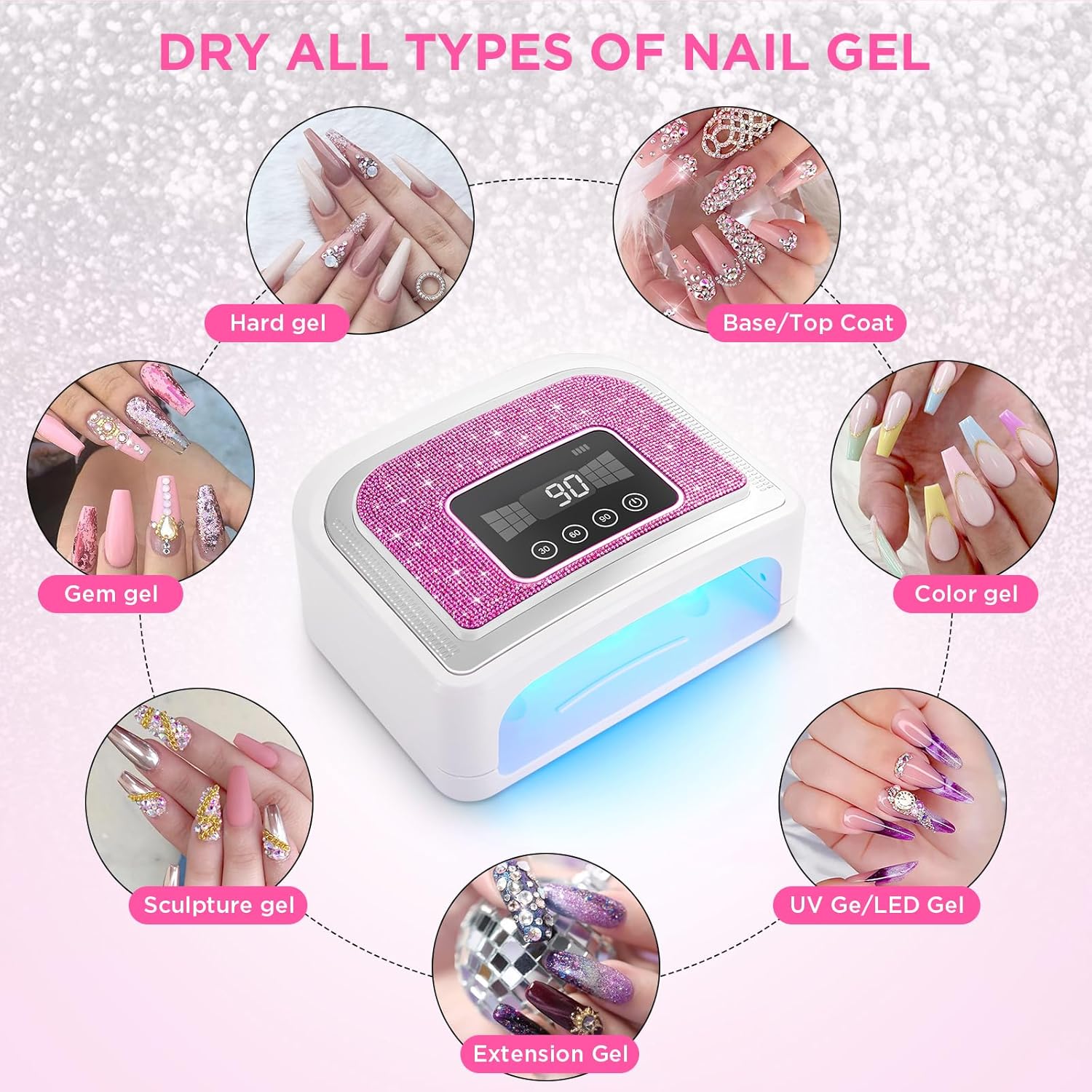 - ๐ ใCuring All GelใUV light for nails works with all gel brands. Base/Top Coat, Color /Hard /Poly/Sculpture Gels, Builder, Acrylic, Gem Glue etc.(not for regular/air -dry nail polish.) Enjoy high-quality salon manicures at home with your friends and family.
