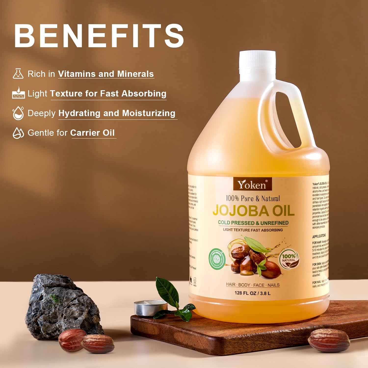 Yoken 1 Gallon Jojoba Oil EWG Verified - 100% Pure Jojoba Oils Bulk Cold Pressed Unrefined Hexane Free Virgin Golden jojoba Carrier Oil for Hair Skin Massage DIY Natural Body Moisturizer