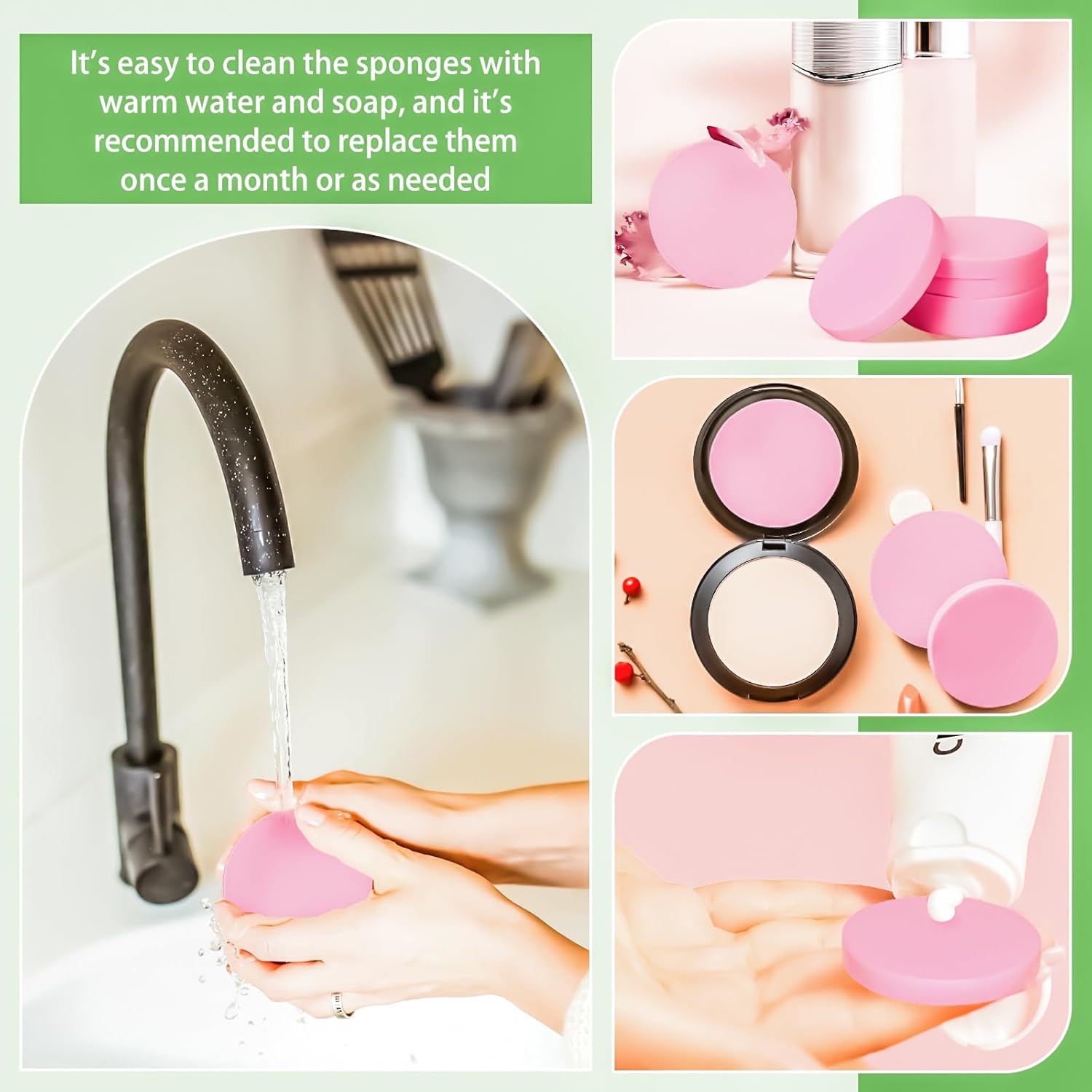 - Features: Makeup sponge round foam pads are soft enough to catch every area that needs to be covered, they are flexible enough to go deep into the corners of the eyes and soft to the touch for a smooth, even base. It's easy to clean the sponges with warm water and soap, and it's recommended to replace them once a month or as needed