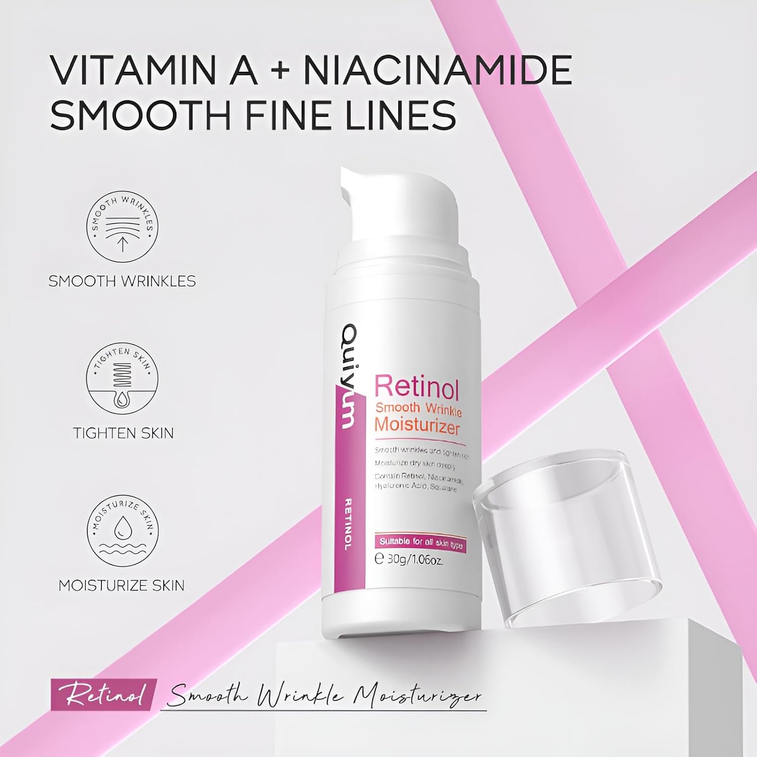 - 【Day & Night Moisturizer】Integrate Quiyum Retinol Anti Wrinkle Moisturizer for Face into your daily skincare regimen for both morning and evening use. Retinol acts as a crucial component in preventing premature aging, making it an essential part of your anti wrinkle routine. Suitable for all skin types and ages, Quiyum Retinol Face Moisturizer Set helps achieve a youthful appearance. For daytime use, pair with SPF 30 sunscreen.