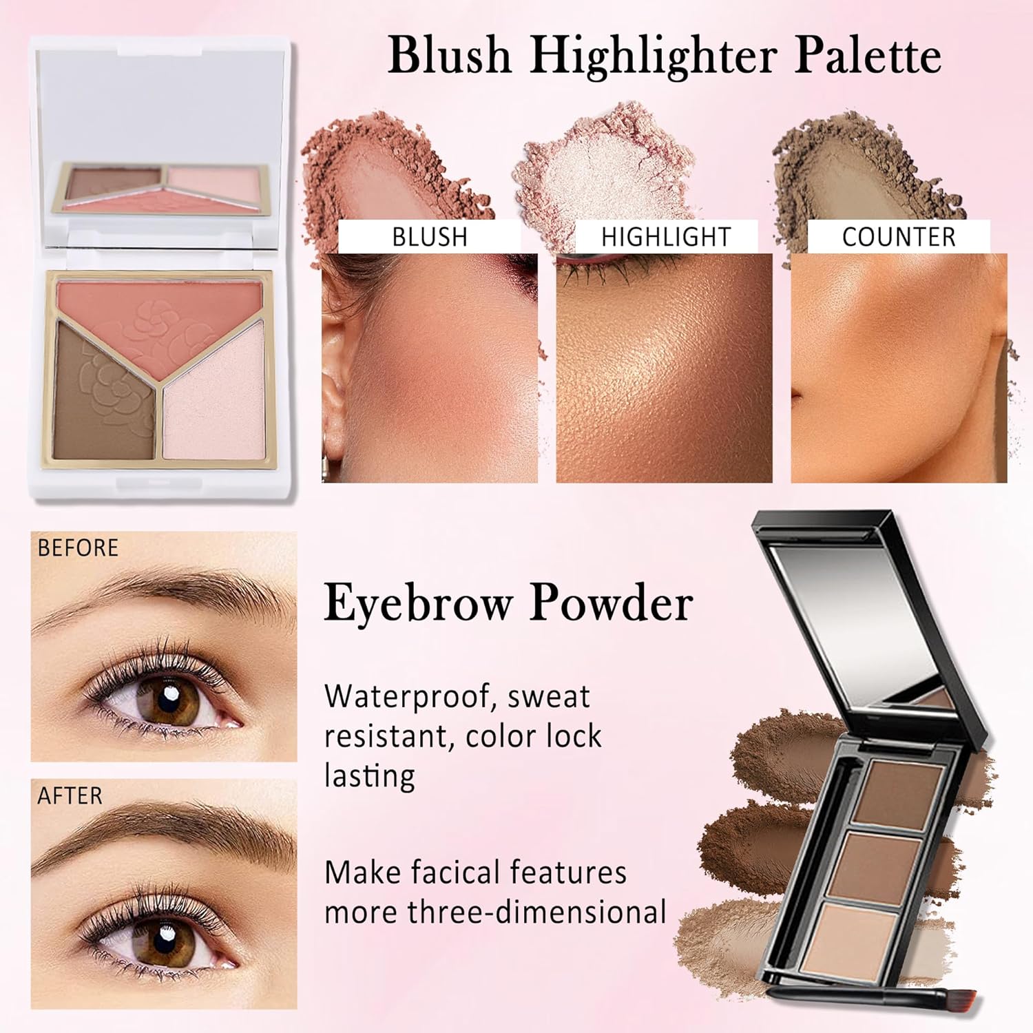 - All In One Makeup Set - Makeup set include 2pcs foundation, 2pcs eye shadow palette, 4 in 1 lip oil set, 3pcs lip gloss, black 5d mascara, black eyeliner stamp pencil, 3 in 1 eyebrow powder palette, 3 in 1 blush & highlighter palette, face primer, 2pcs makeup puff, cosmetic bag. It can meet all the beginners’ or professional makeup artists’ needs for daily makeup.