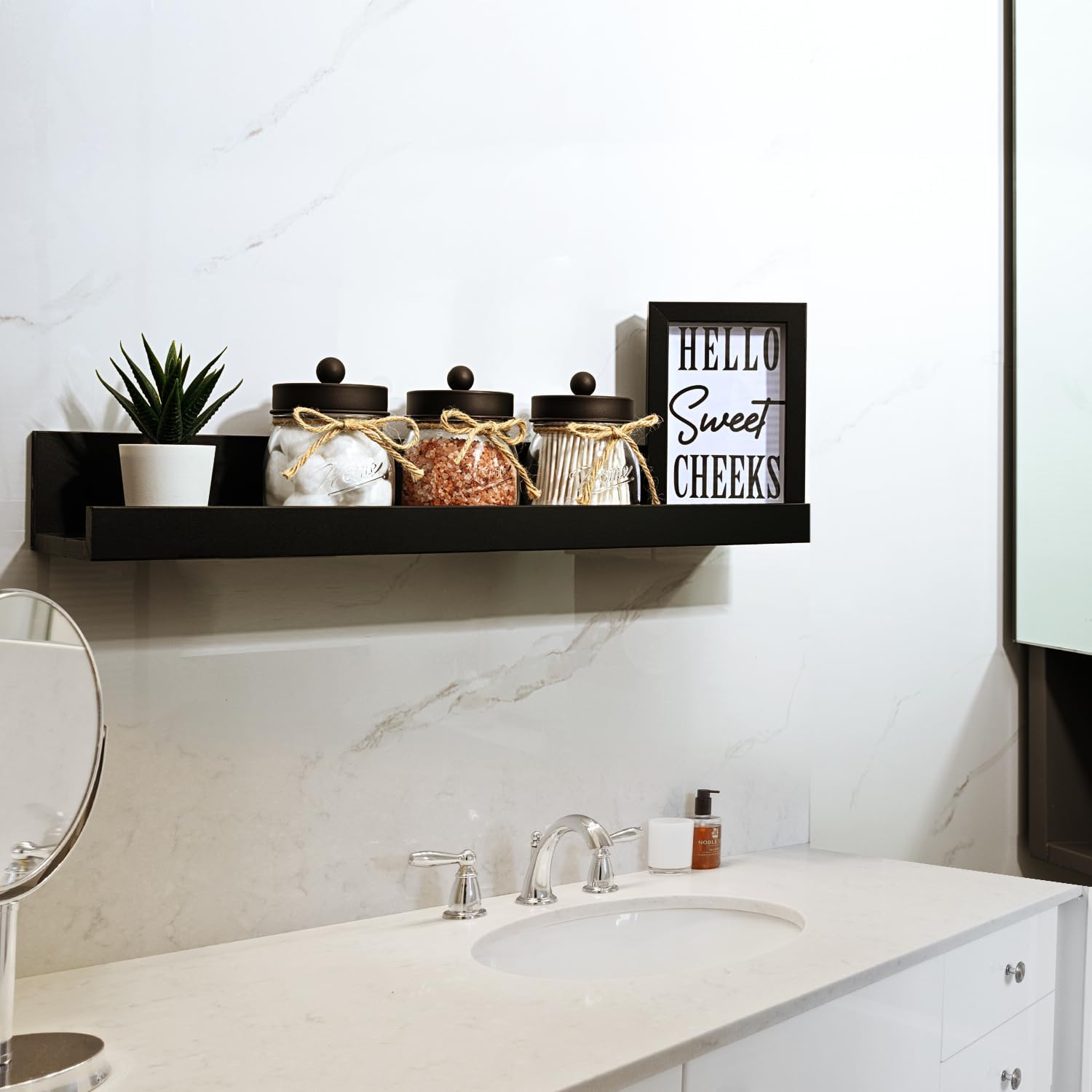 - ๐Elegant and Cute Bathroom Decor: Add charm to your bathroom with this glass bathroom mason jars set! Perfect accent to bathroom shelving, bathroom countertop, makeup vanity, carft room, black and white accented bathroom, and guest bathroom. Ideal for home decor, this collection embodies a variety of styles including rustic, western, farmhouse, and contemporary designs. It is particularly well-suited for bathroom decor and offers a versatile aesthetic that complements both traditional and modern interiors.