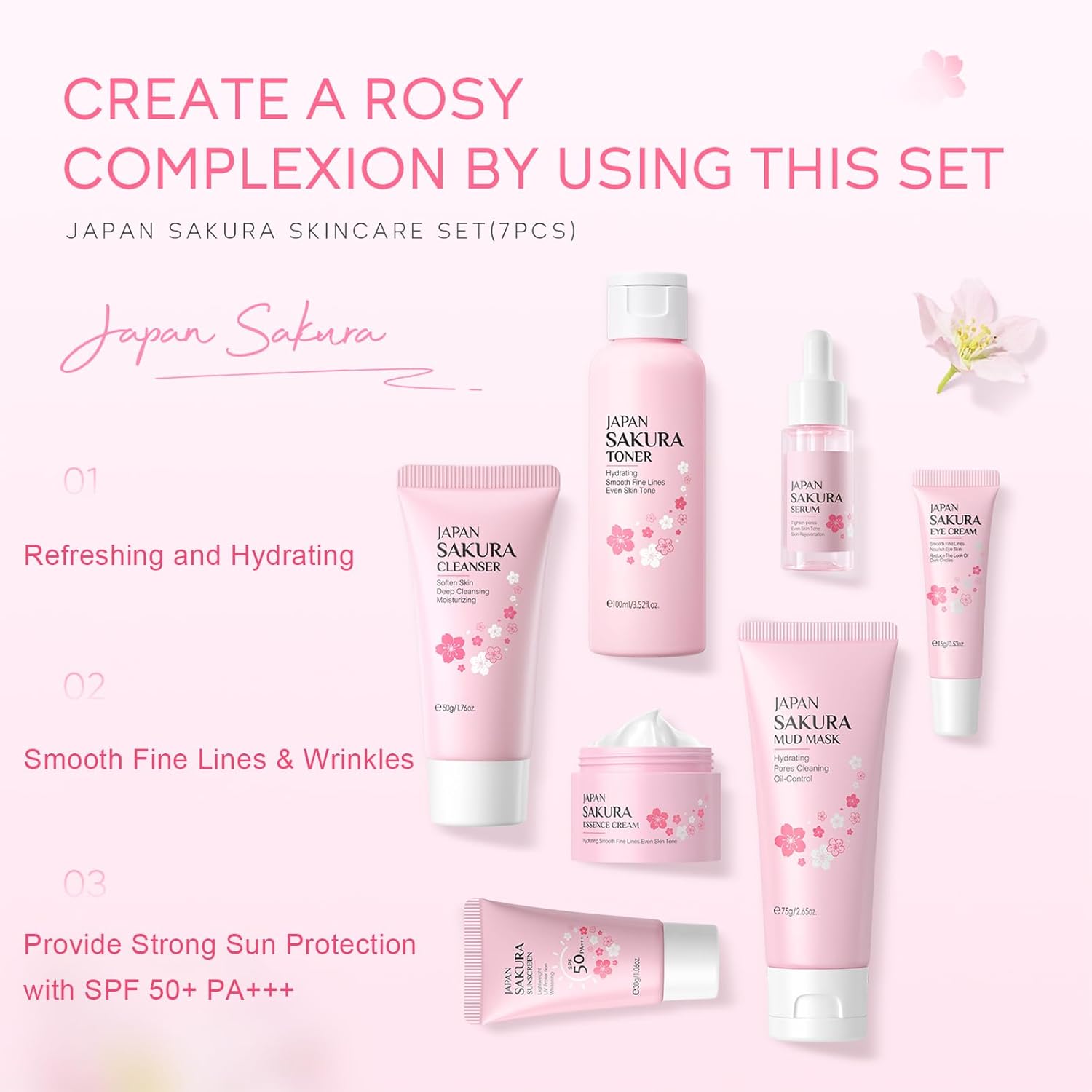 - 🌸【JAPAN SKIN CARE KITS】This face skin care kit uses the natural power of cherry blossoms. Our skincare set gifts for teenage girls contain our Cleanser, Toner, Cream, Eye Cream, Sunscreen SPF 50, Mud Mask and Serum. A full set of skin care serum for body and face protects and nourishes skin, making your skin look young, elastic and more energetic!
