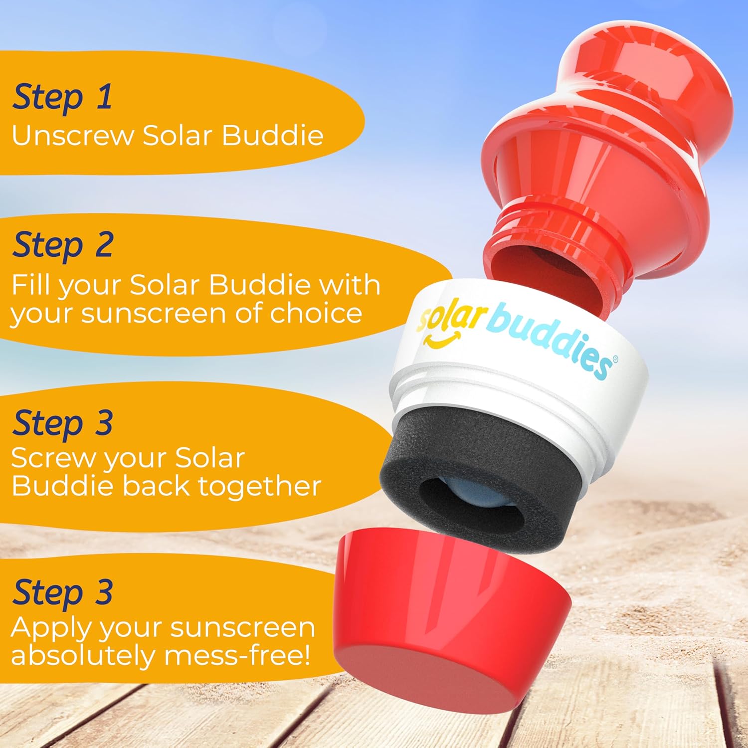 - PERFECT TRAVEL SIZE: Perfectly sized for on-the-go use, it holds 100ml or 3.4fl oz, fitting comfortably in your hand luggage. A clearly marked 100ml indicator under the yellow neck of the bottle helps you stay within liquid carry-on limits. The Solar Buddies refillable sunscreen applicator is a travel essential for kids!