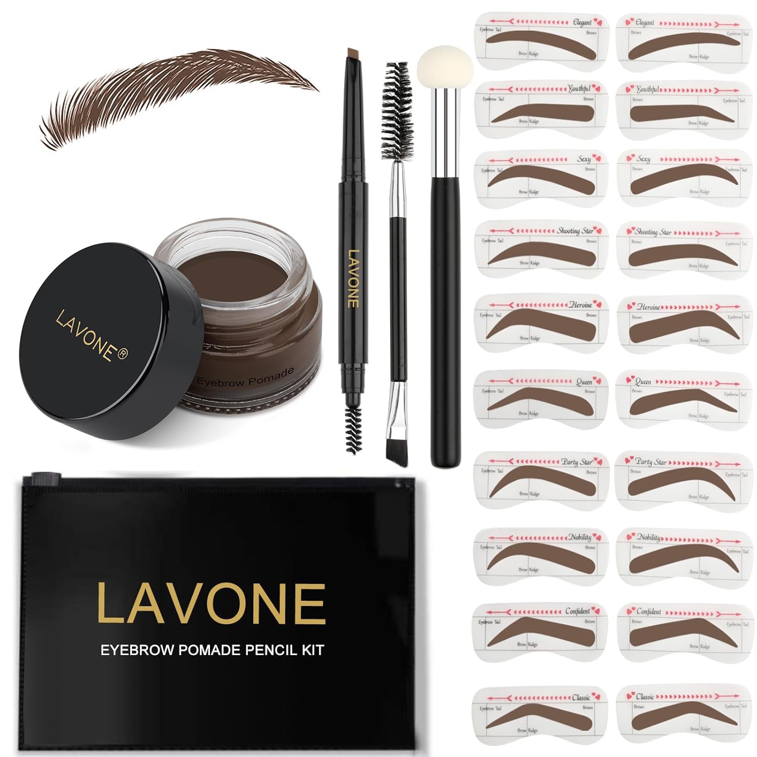 - [Whatโs in the eyebrow kit]: LAVONE makeup eyebrow kit includes eyebrow powder(Dark Brunette), brow pencil (dark brown), 20 eyebrow stencils (10 different shapes), a sponge applicator, a dual precision brush and a zipper pouch for on the go.