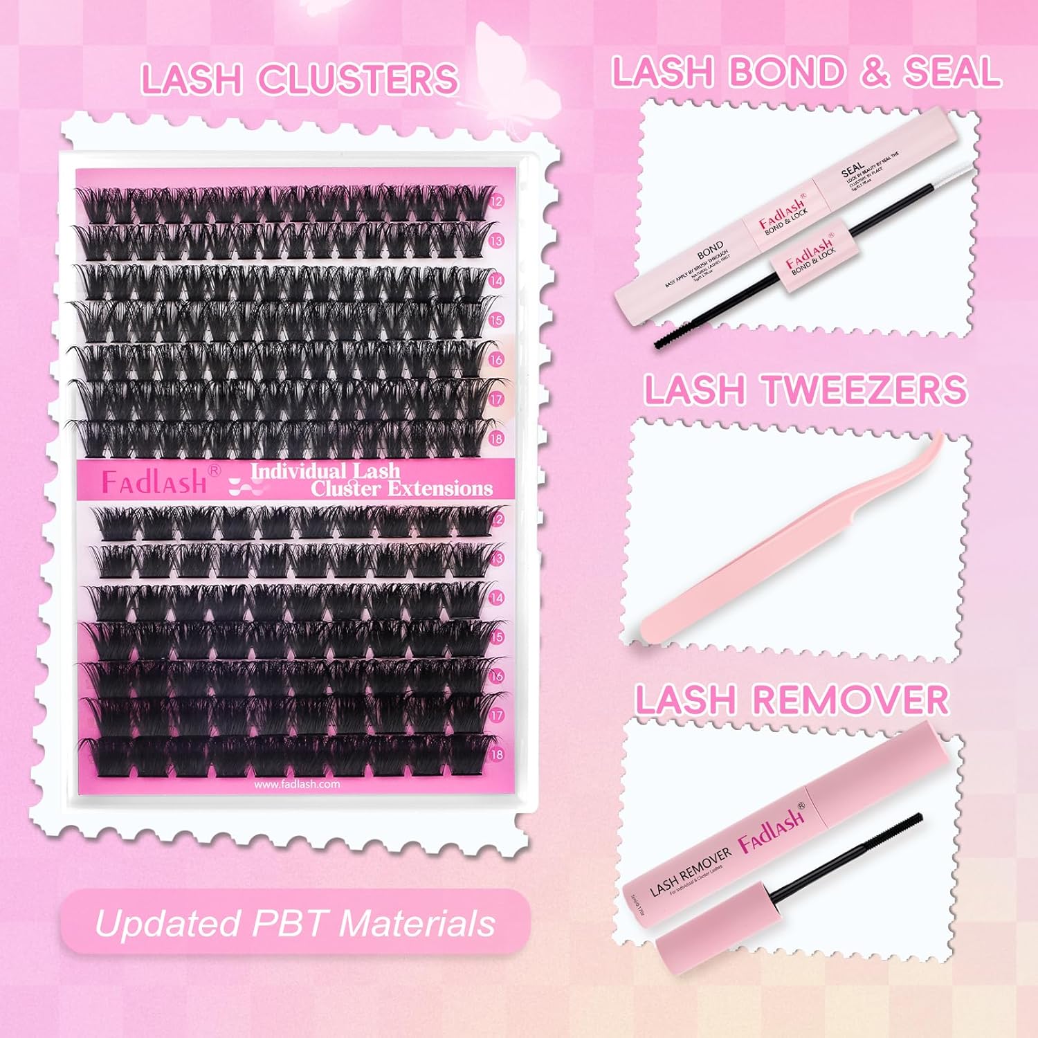 FADLASH DIY Lash Extension Kit - Lash Clusters with D Curl, Bond & Seal - Glue Remover & Tweezers for Home Use (100D+200D-0.07D-12-18MIX)