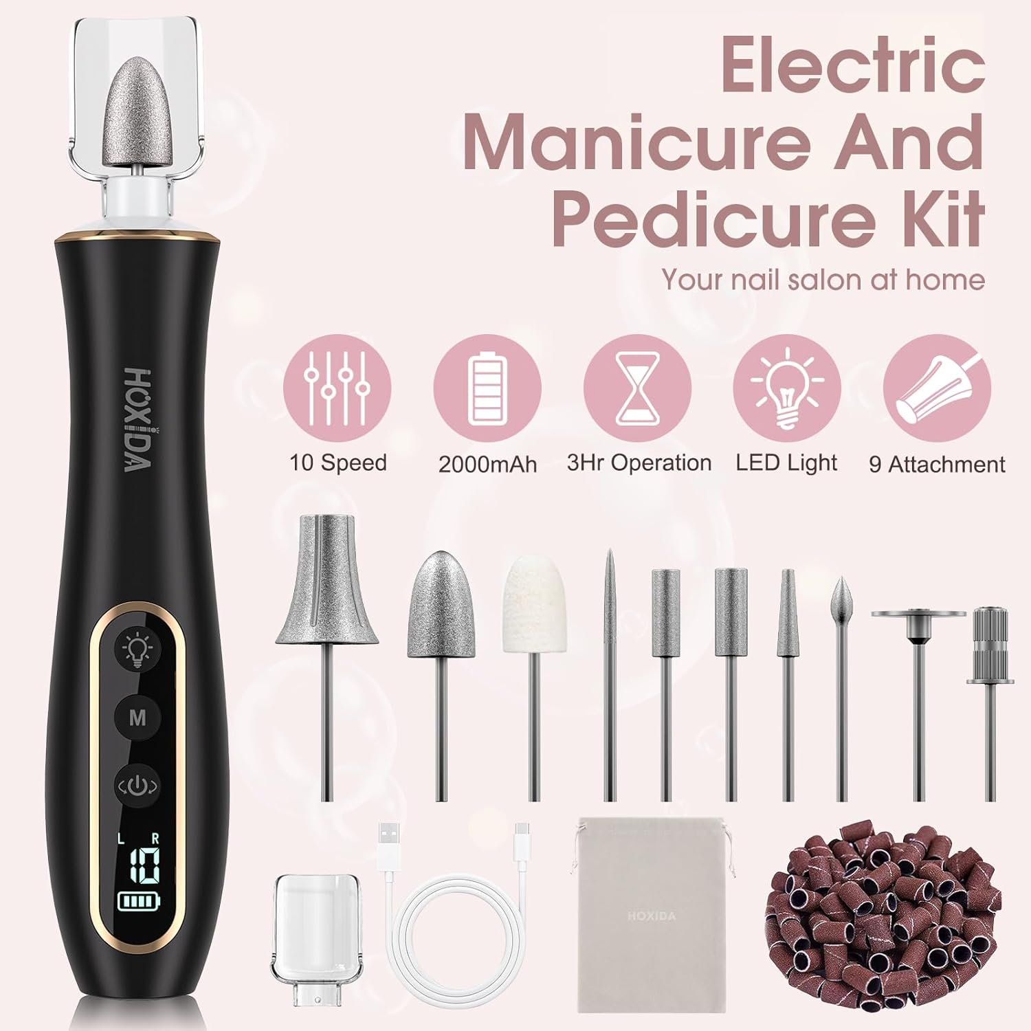 - What you will get: The Electric Nail Drill Kit comes with 9 interchangeable drill bits,100 sanding bands , Type-C charging cable to give your nails a salon-worthy look, this nail kits are the best gift for your nail lovers friends, It's so convenient and you can do a hand or foot care salon privately at home, and everything you need is included.