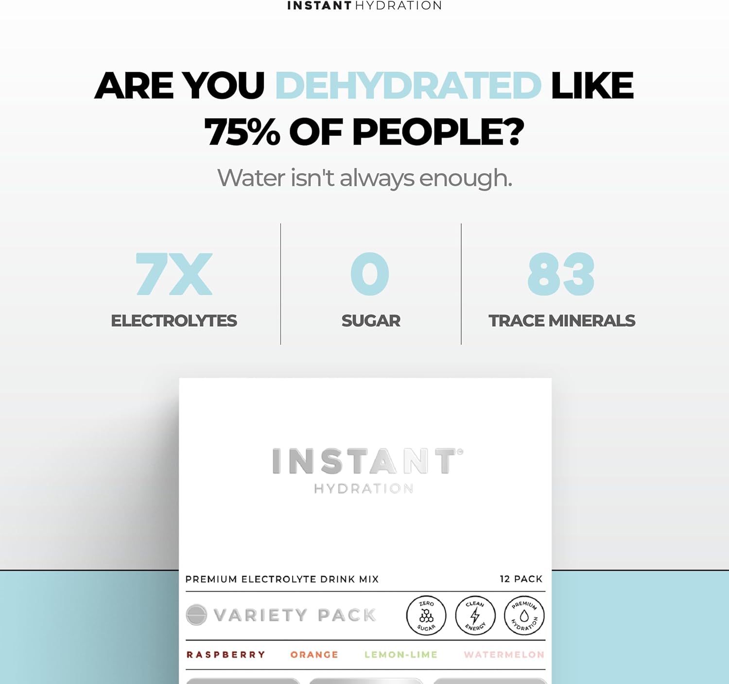 Instant Hydration Electrolytes Powder Packets - Variety Pack - Zero Sugar - Keto, Vegan, Gluten-Free, Non-GMO - Boost Recovery, Brain Function, Muscle & Tissue Health - 12 Sticks