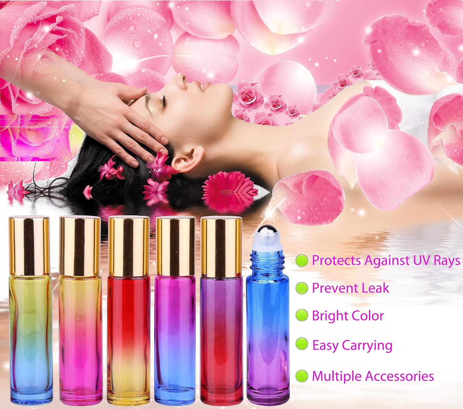 inice 4 Pack 10ml Roller Bottles for Essential Oils,Gradient Color Glass Bottle Roll on Stainless Steel Ball with Golden Metal Cap