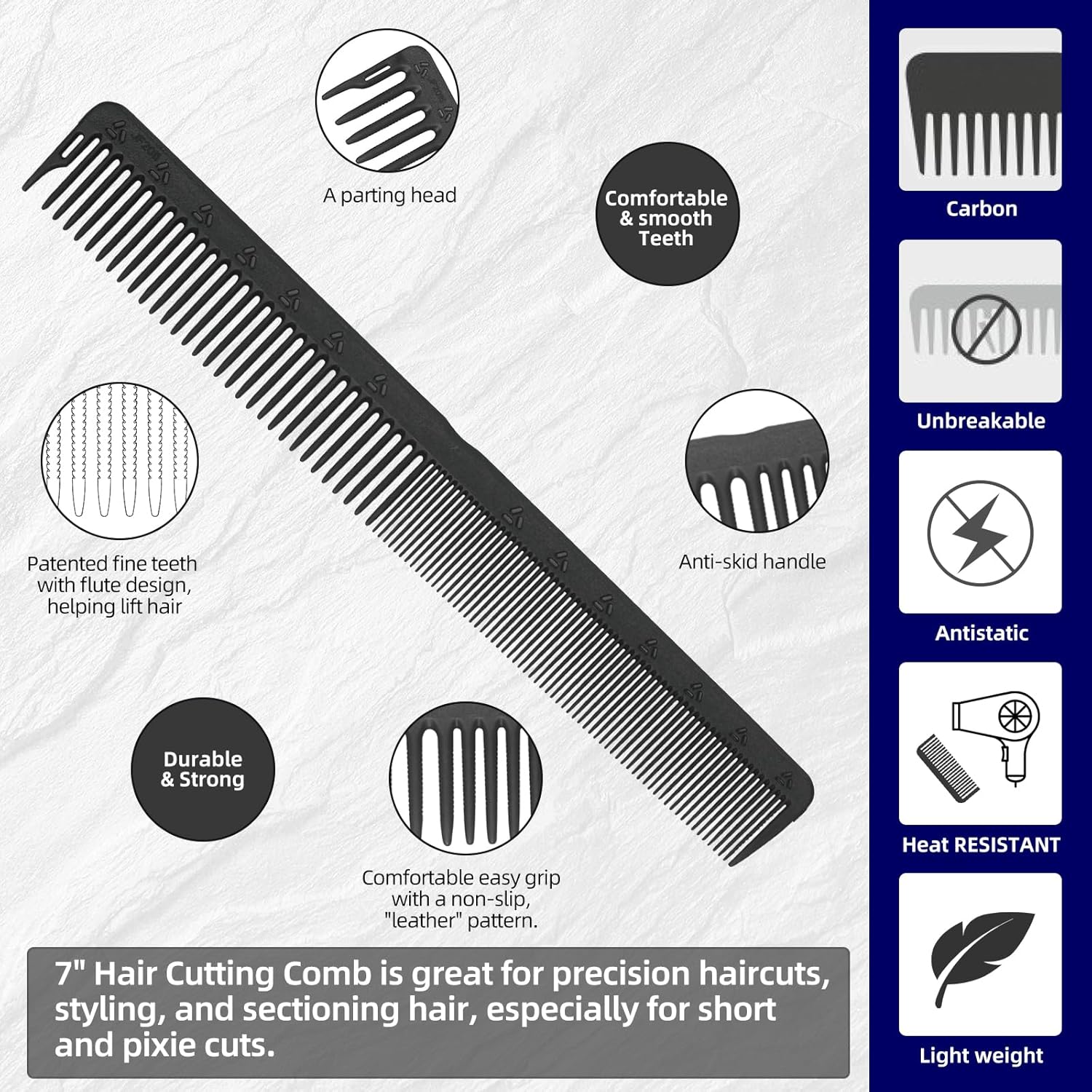 - Durable and Heat Resistant: This 2-pack carbon combs are designed to withstand heat up to 350 F, making them perfect for use with heated styling tools. Additionally, their durability is enhanced by their virtually unbreakable nature and lightweight design. These features make them an ideal choice as hair cutting combs.
