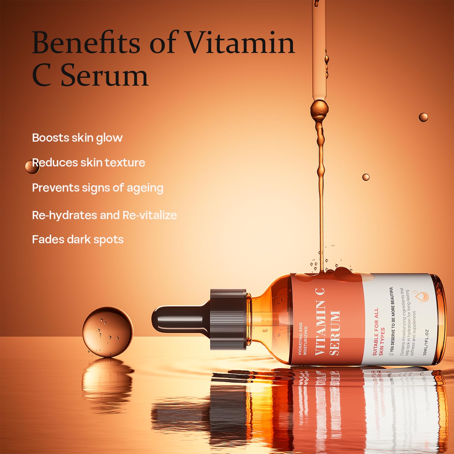 - UNIVERSAL COMPATIBILITY FOR ALL SKIN TYPES:This vitamin c brightening serum is expertly formulated to suit every skin type .The lightweight, non-comedogenic formula absorbs quickly without clogging pores, making it ideal for daily use. Whether you’re looking to brighten dull skin, reduce dark spots, or combat signs of aging, this vitamin c brightening serum adapts seamlessly to your unique skincare needs. No matter your skin concerns, this serum is your go-to for healthier, glowing skin that feels as good as it looks.