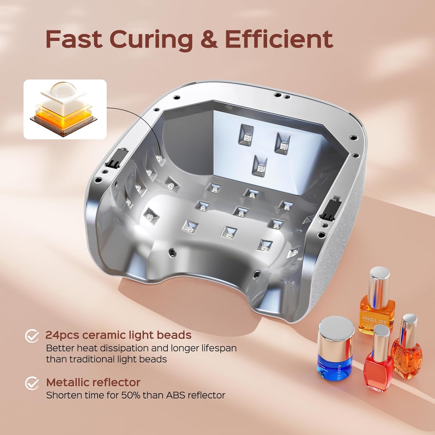 - [Smart Sensor and Adjustable 4 Timers] Built-in infrared sensor lights, the UV LED nail lamp automatically turns on when you place your hand or foot inside, and turns off when you take it out. It is adjustable in 4 timer settings of 15s/30s/60s/99s, which can be selected according to the time for different gel nails.