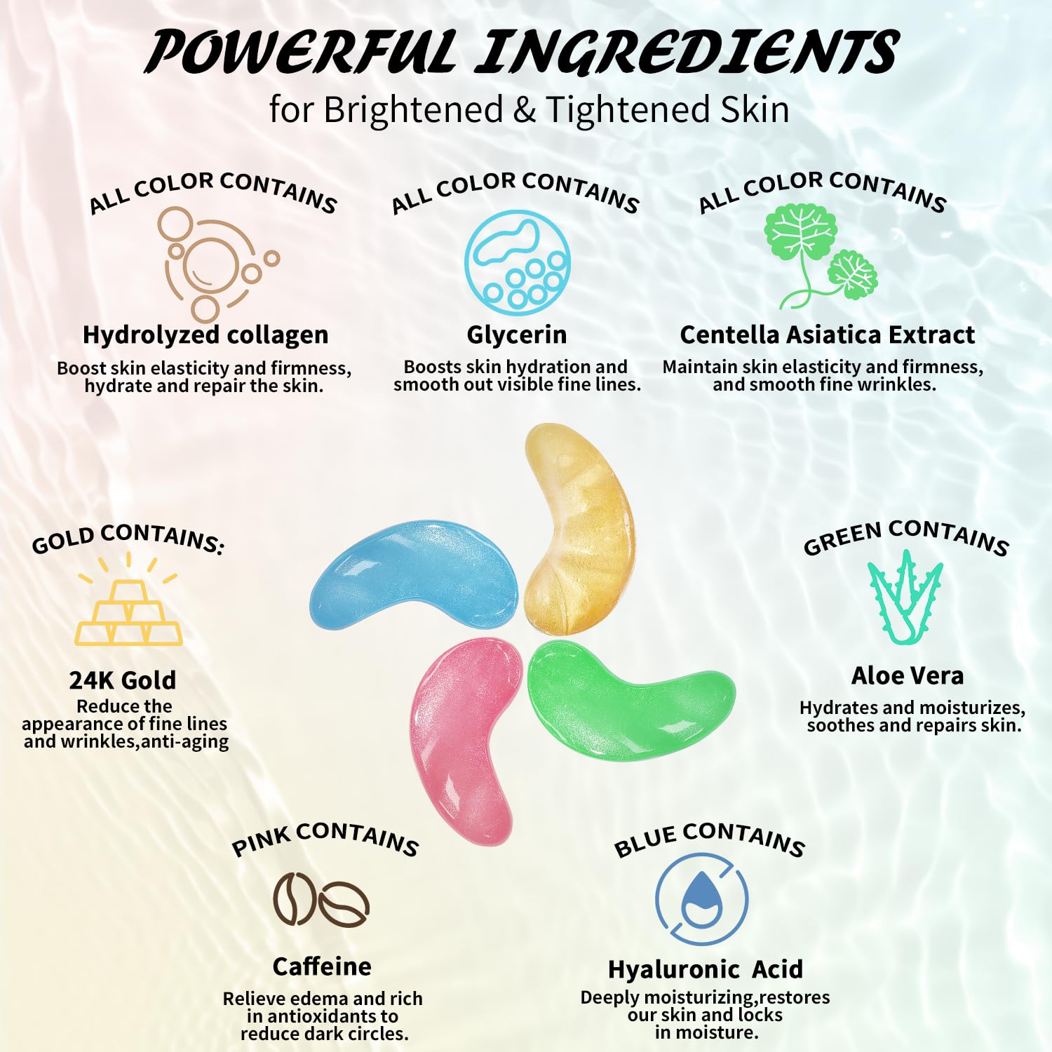 - Safe & Effective Ingredients: Our under-eye patches are infused with a powerful blend of collagen, hyaluronic acid, caffeine, and natural plant extracts which work together to deeply repair, soothe, rejuvenate, and protect the delicate skin around your eyes β without any irritation. The ingredients of our under eye patches for dark circles and puffy eyes are vegan, sulfate-free, and gentle on all skin types.