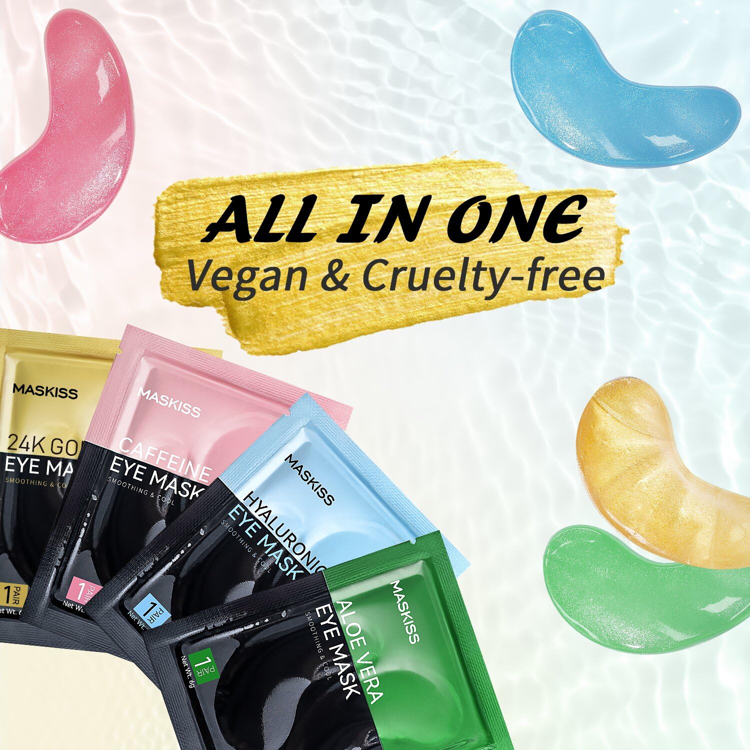 - Comprehensive Eye Care Treatment: The Maskiss set includes 4 colors, 25 pairs of under-eye patches. 24k Gold eye mask helps to smooth the skin, reduce fine lines and wrinkles. Caffeine eye patches help promotes eye metabolism and circulation, and reduces eye bags and puffy eyes. Hyaluronic acid eye masks help to fade dry lines and wrinkles, and locks in moisture and nutrition. Aloe vera eye patch helps to reduce pigmentation, repair the healing barrier, and gently moisturize the skin. Add these to your daily self-care routine for a visibly younger, well-rested appearance.