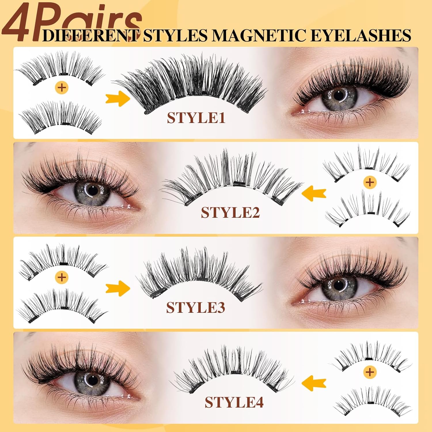 - Magnetic Eyelashes Kit: The magnetic lashes kit includes 4 pair of magnetic eyelashes, 2 magnetic applicator, 2 small magnetic box with a mirror, and one instruction sheet. Magnetic lashes are easy to operate and only take 2 minute to complete, effectively saving your makeup time and allowing you to stay on through an entire sweaty rave!