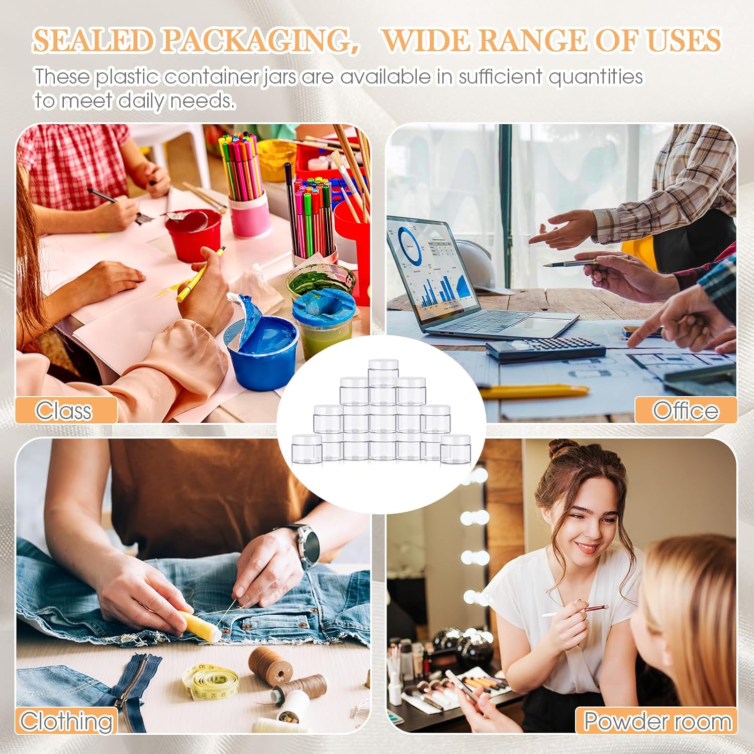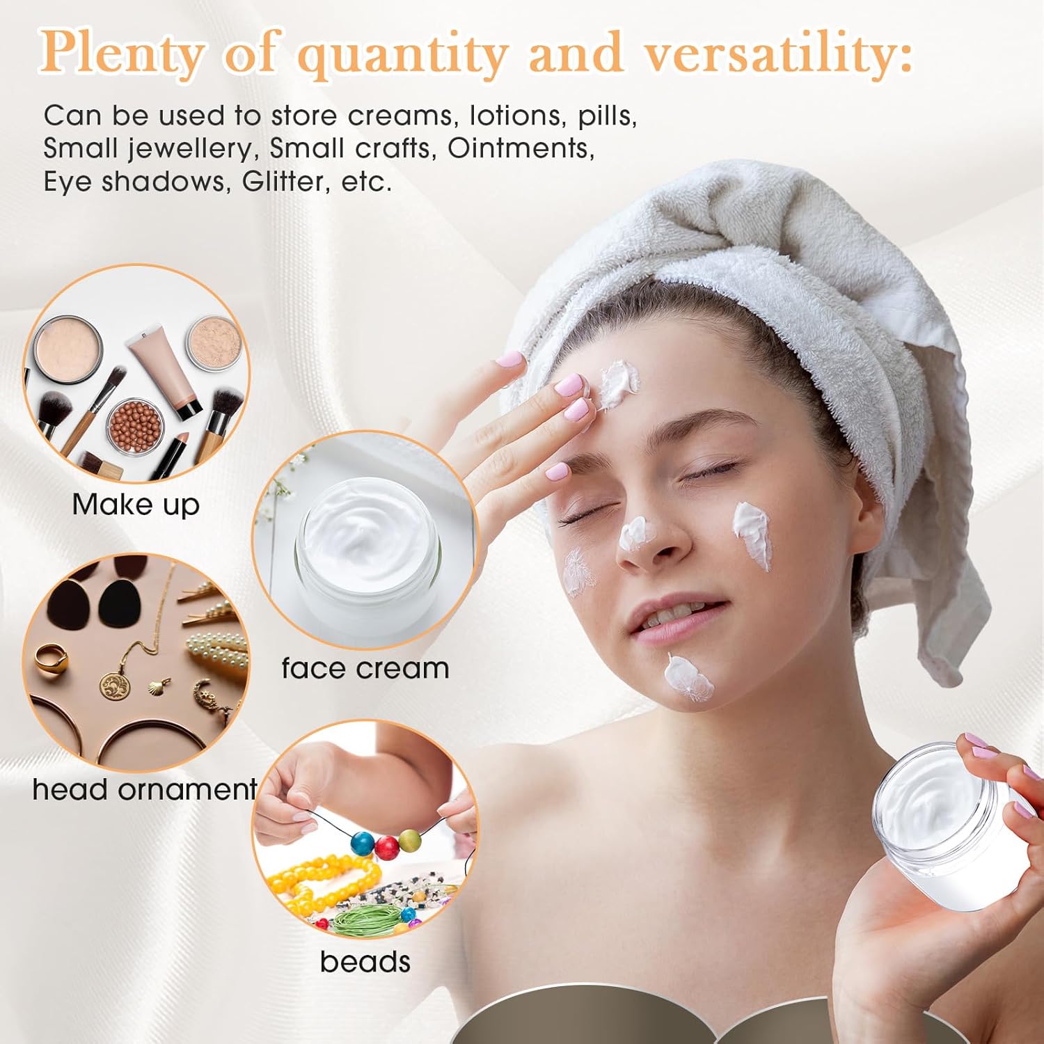 - Multifunctional Containers: you can use these plastic jar containers with lids to store your personal beauty products for travel, ideal to dispense; You can also use it to store homemade sugar scrub cream, body lotions, bath butter soap gifts, body butters and hair moisturizers, small and easily lost jewelry, small crafts like beads, seasonings, acrylic paints, flower seeds, rhinestones etc., which will keep your things organized and make your life more convenient
