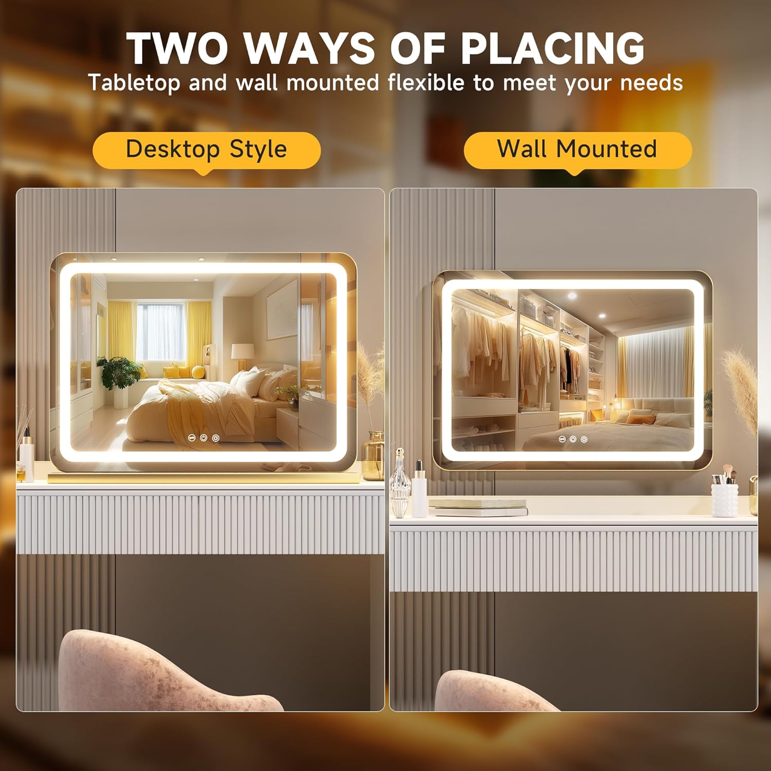 • 👍【Smart Touch Control & Memory Function】This makeup mirror with lights has 3 smart touch buttons, turn on/off the light by touching the sensor switch, Press left button to change the color modes, long press right button to adjust the led brightness. This lighted makeup mirror is specially designed memory functionfunction keep your lights setting like your last use.