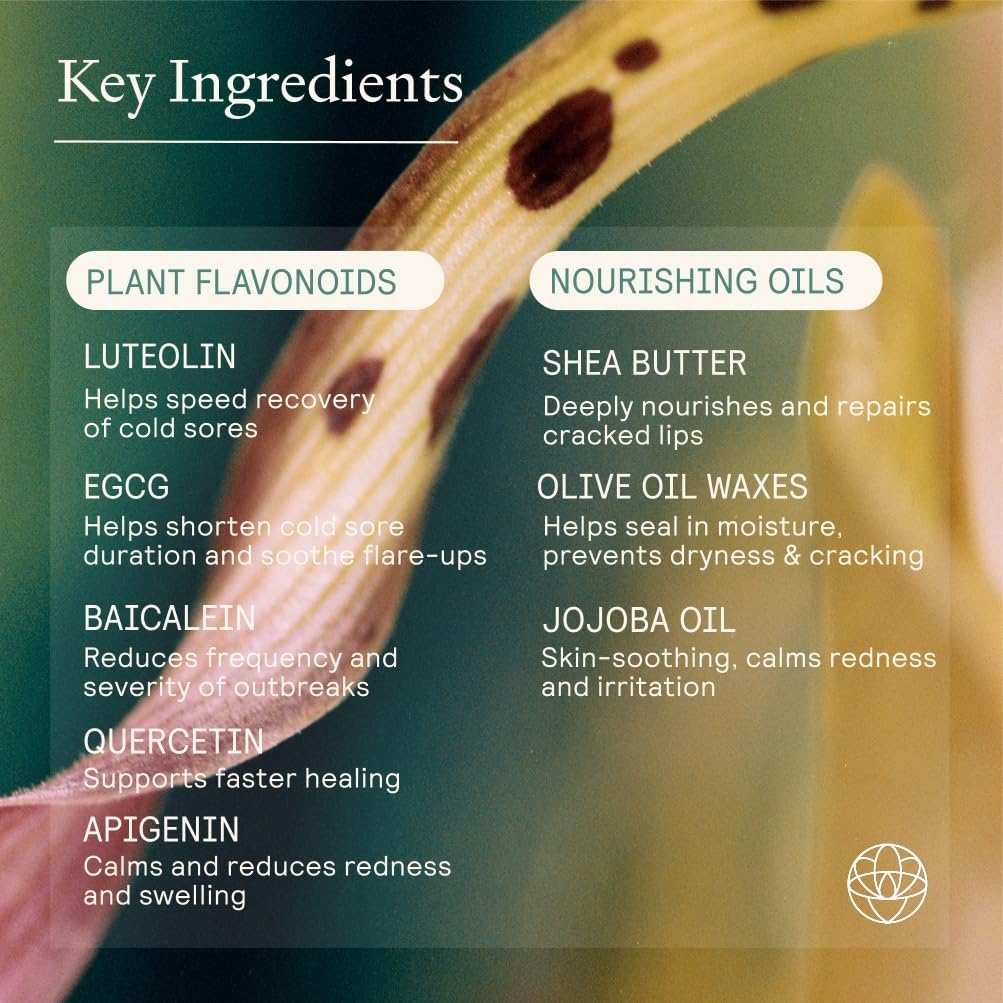 - COLD SORE SUPPORT β Formulated with soothing 5 powerful plant flavonoids to help relieve symptoms during flare-ups while promoting healthy, resilient lips year-round. A little goes a long way!