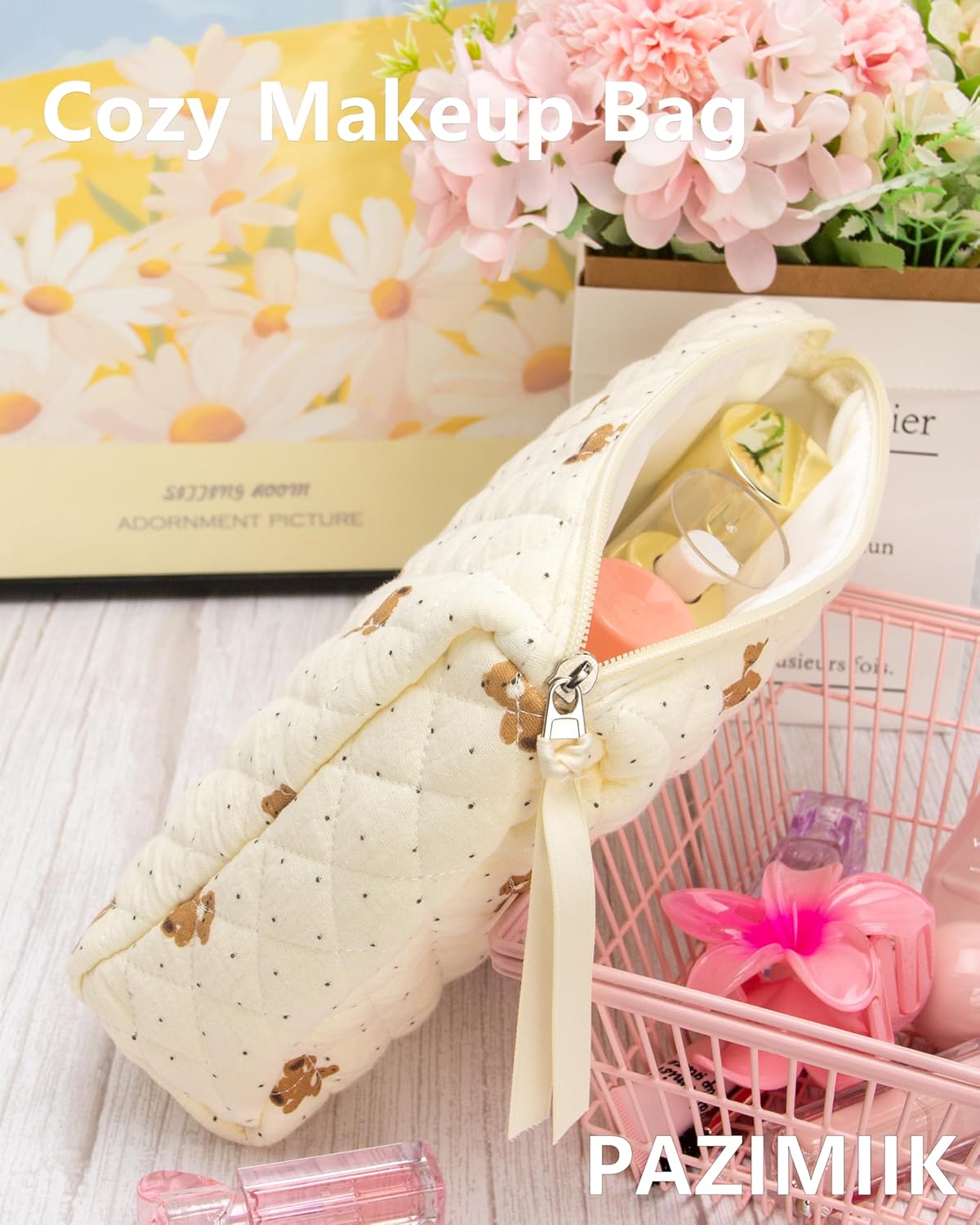 PAZIMIIK Quilted Makeup Bag Large Travel Zipper Soft Cosmetic Pouch for Women Girls Make Up,Gauze Bear