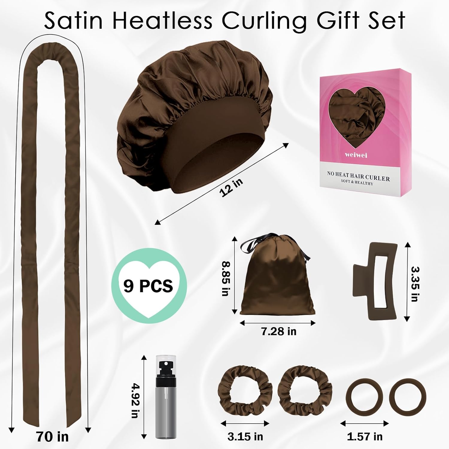 - 9 Pcs Heatless Curl Set: Includes 1 x 70" satin hair curler, 1 x satin hair bonnet, 1 x hair clip, 2 x satin scrunchies, 2 x elastic hair ties, 1 x satin storage bag, and 1 x spray bottle. Packaged in a beautiful box, it's the perfect present for her