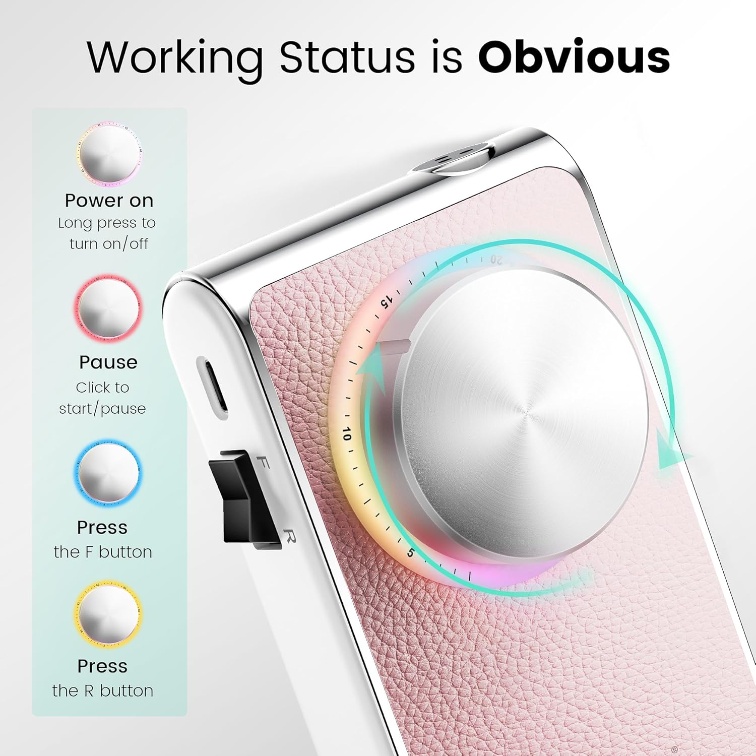 - 【Rainbow Light Turntable Design】Aviation cluminum knob, flexible control, the light color changes according to the working status(four colors). The ergonomic handle is crafted with a special textured finish, providing a non-slip grip and comfortable handling during use.