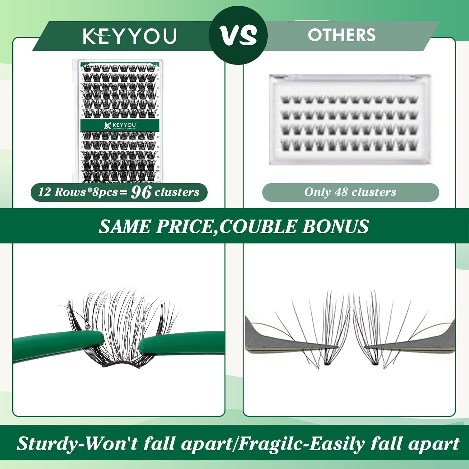 - 【Soft&Comfortable】KEYYOU lash cluster are made of imported materials,the stem line is thinner and softer, the eyelash cluster are lighter and more comfortable to wear.96 clusters in one tray ,more cost-effective.