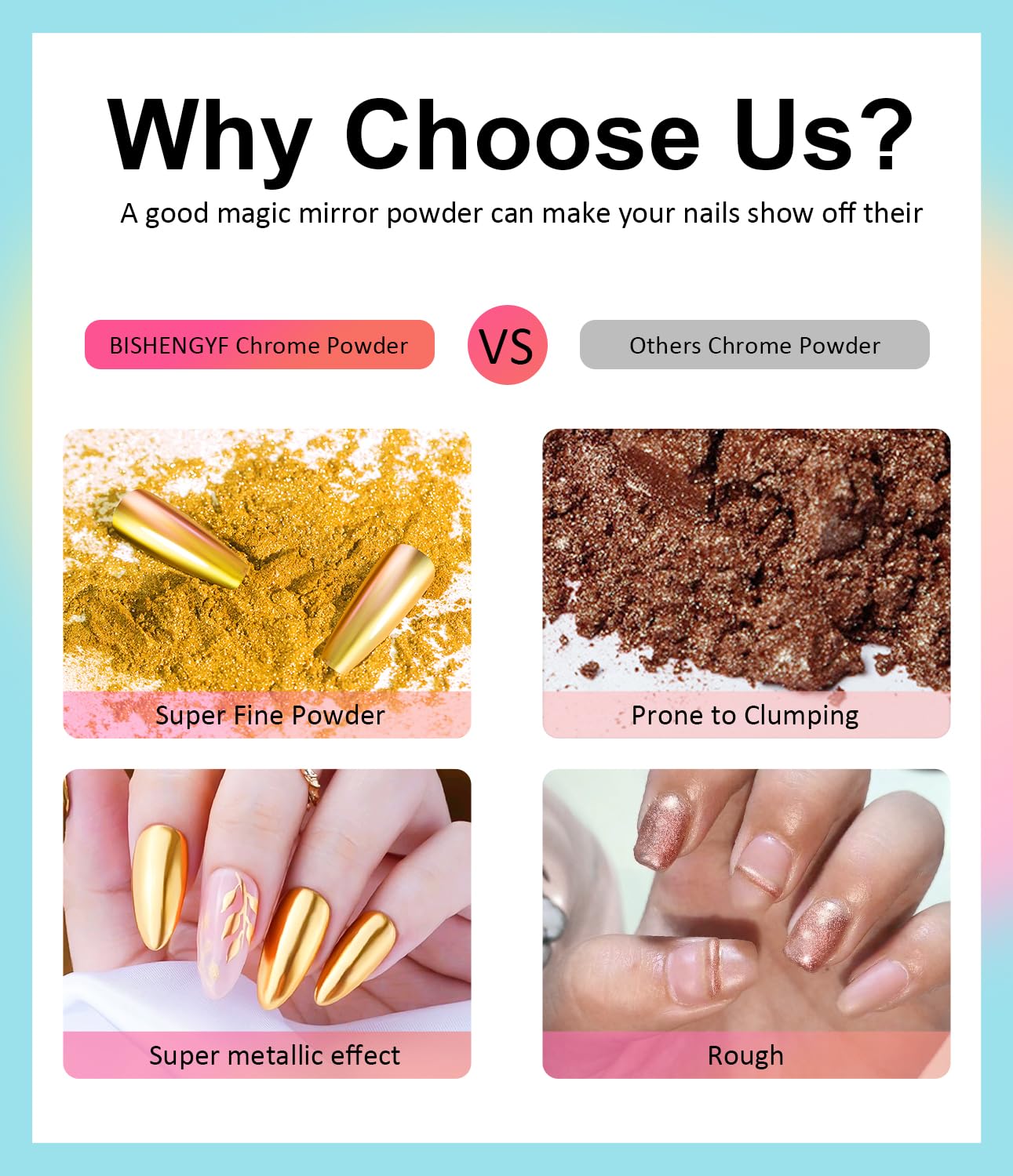 - Unleash Ultimate Metallic Glam: Add a touch of luxury to your fingertips with BISHENGYF chrome powder for nails. With just a gentle swipe of this dazzling metallic nail powder, your nails will boast an eye-catching metallic mirror finish. Wherever you go, nail glitter powder flaunt your unique sparkle!