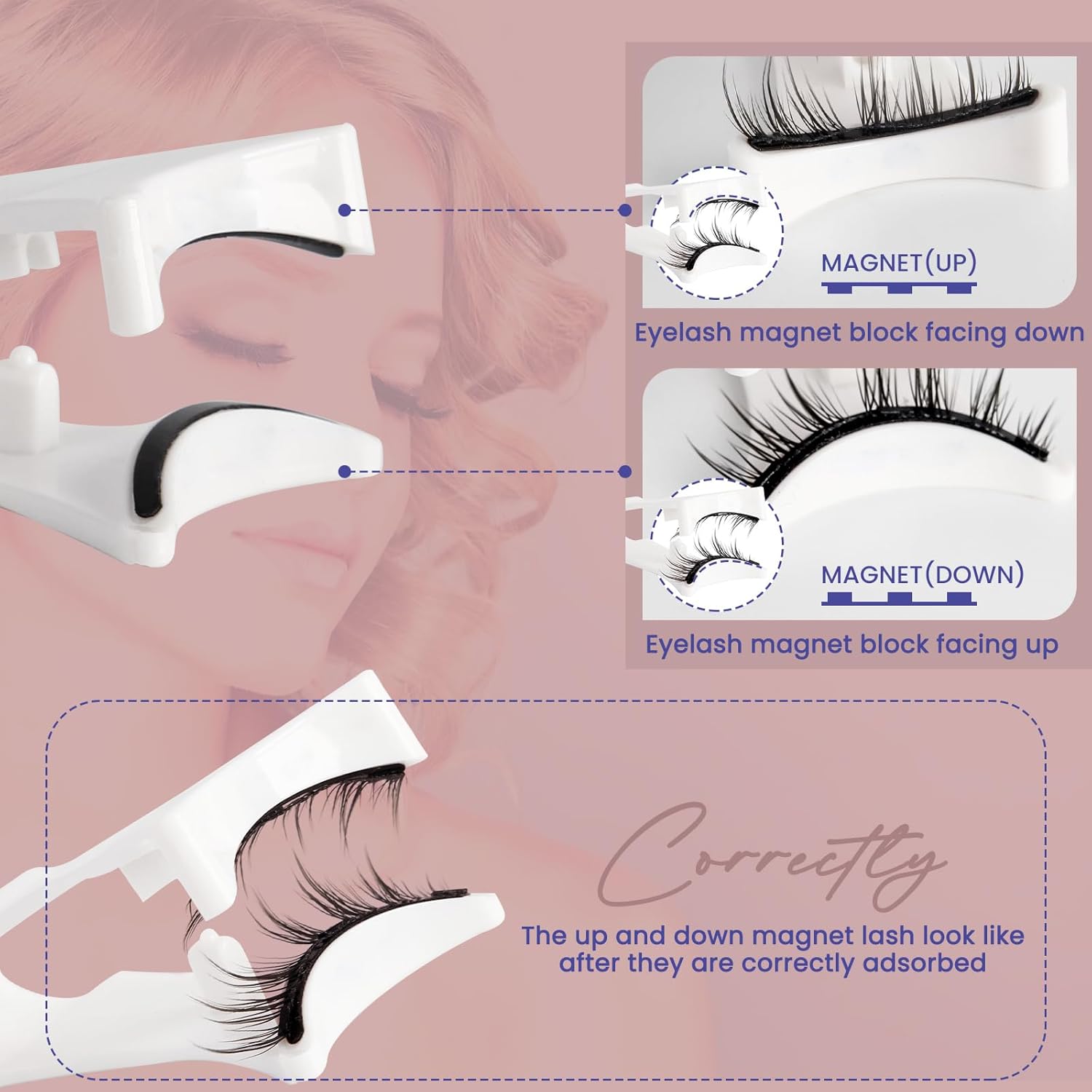- How To Use: 1. Gently push to separate the two pieces of magnetic eyelashes. 2. Upper lashes: the magnet is attracted to the "up" part of the clip in the downward direction. Lower lashes: the magnet attaches to the "down" part of the clip in an upward direction. 3. Check that magnetic lashes are correctly placed:The direction of the eyelashes is upwards and the magnets are exposed. 4. Curl your natural lashes. Then put the magnetic lashes on the root of your natural lashes.