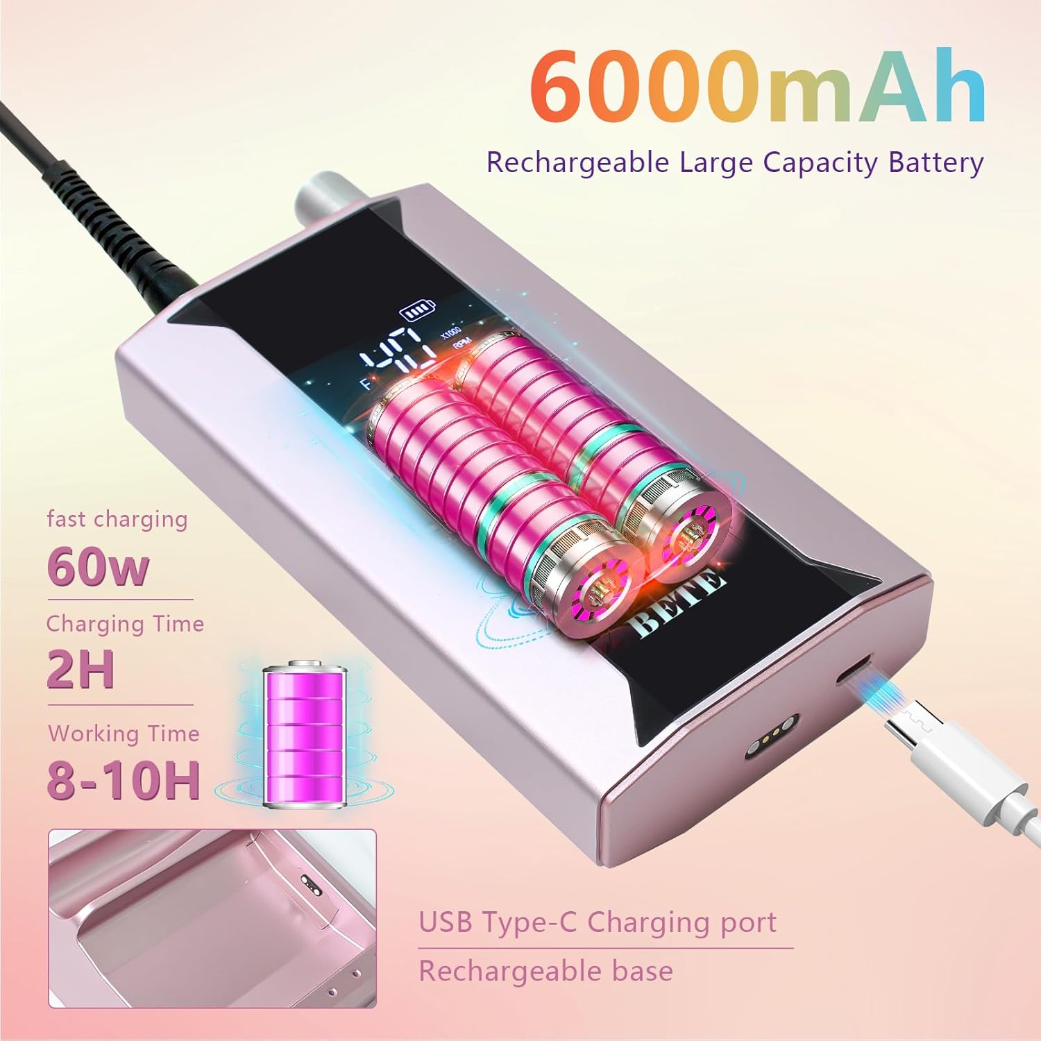 - Rechargeable and Durable: BETE nail drill machine is equipped with a built-in 6000mAh battery with strong storage capacity, a 60W fast charging cable with USB port. It can be charged for 3 hours and can be used continuously for 12 hours